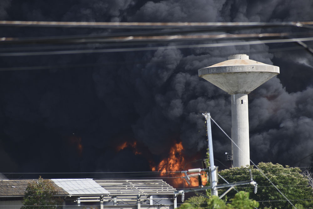 8月7日,古巴馬坦薩斯省火災現(xiàn)場的儲油罐繼續(xù)燃燒并冒出濃煙。