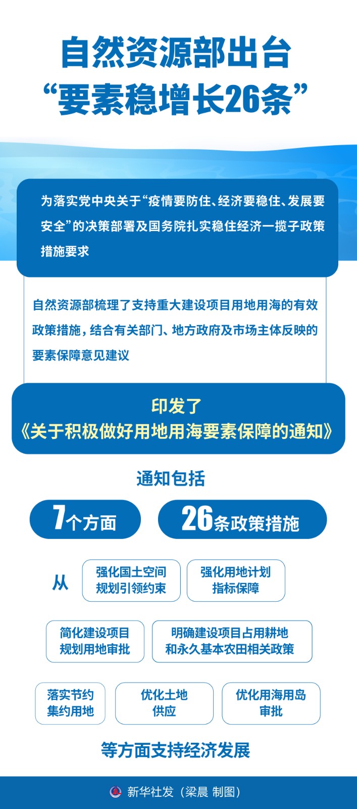 新華社記者8月8日在自然資源部新聞通氣會(huì)上獲悉,為落實(shí)黨中央關(guān)于“疫情要防住、經(jīng)濟(jì)要穩(wěn)住、發(fā)展要安全”的決策部署及國(guó)務(wù)院扎實(shí)穩(wěn)住經(jīng)濟(jì)一攬子政策措施要求,自然資源部梳理了支持重大建設(shè)項(xiàng)目用地用海的有效政策措施,結(jié)合有關(guān)部門、地方政府及市場(chǎng)主體反映的要素保障意見建議,印發(fā)了《關(guān)于積極做好用地用海要素保障的通知》,通知包括7個(gè)方面26條政策措施,從強(qiáng)化國(guó)土空間規(guī)劃引領(lǐng)約束、強(qiáng)化用地計(jì)劃指標(biāo)保障、簡(jiǎn)化建設(shè)項(xiàng)目規(guī)劃用地審批、明確建設(shè)項(xiàng)目占用耕地和永久基本農(nóng)田相關(guān)政策、落實(shí)節(jié)約集約用地、優(yōu)化土地供應(yīng)、優(yōu)化用海用島審批等方面支持經(jīng)濟(jì)發(fā)展。