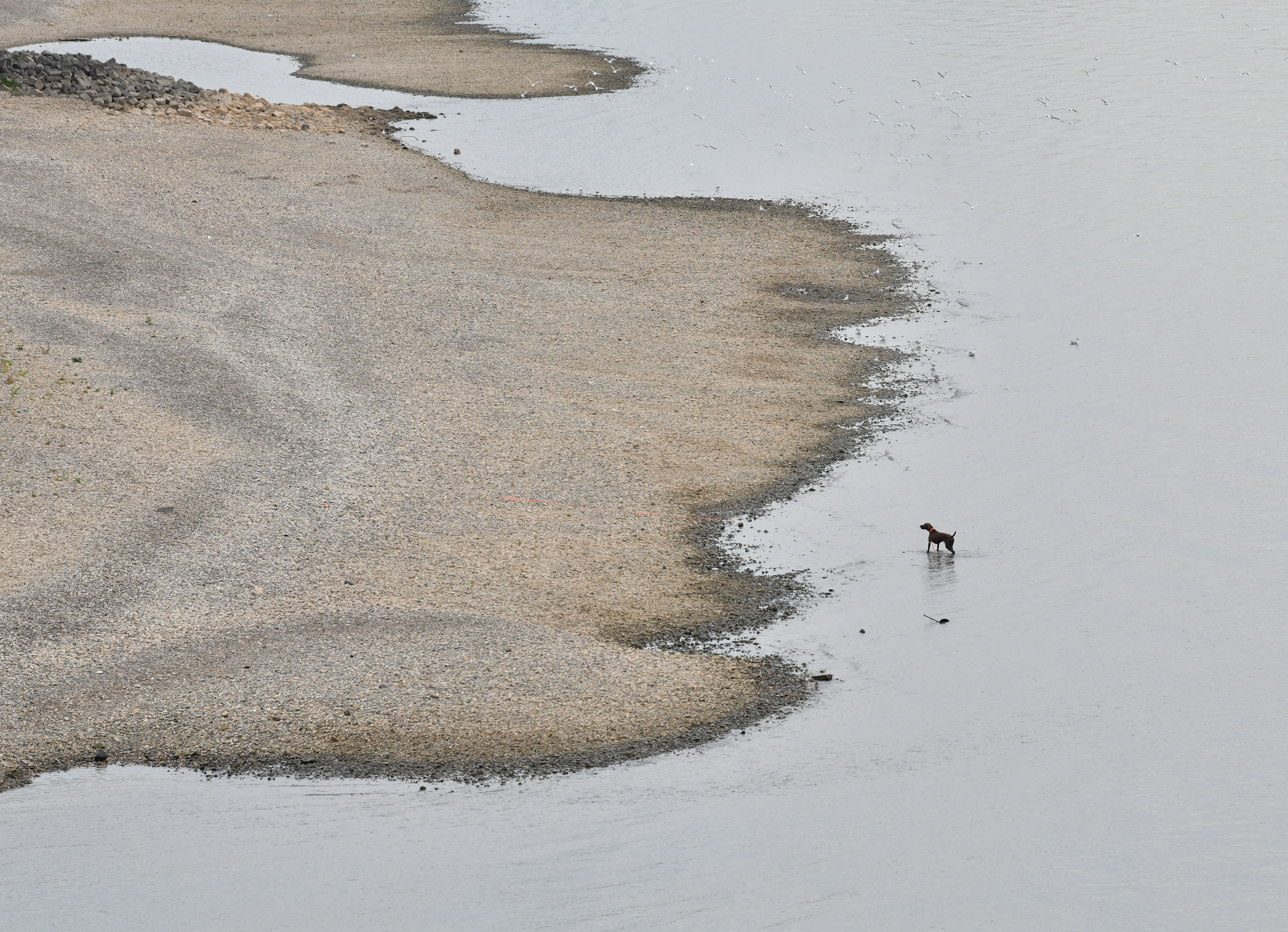 8月17日,在德國(guó)北威州杜塞爾多夫,一只小狗在萊茵河畔玩耍。