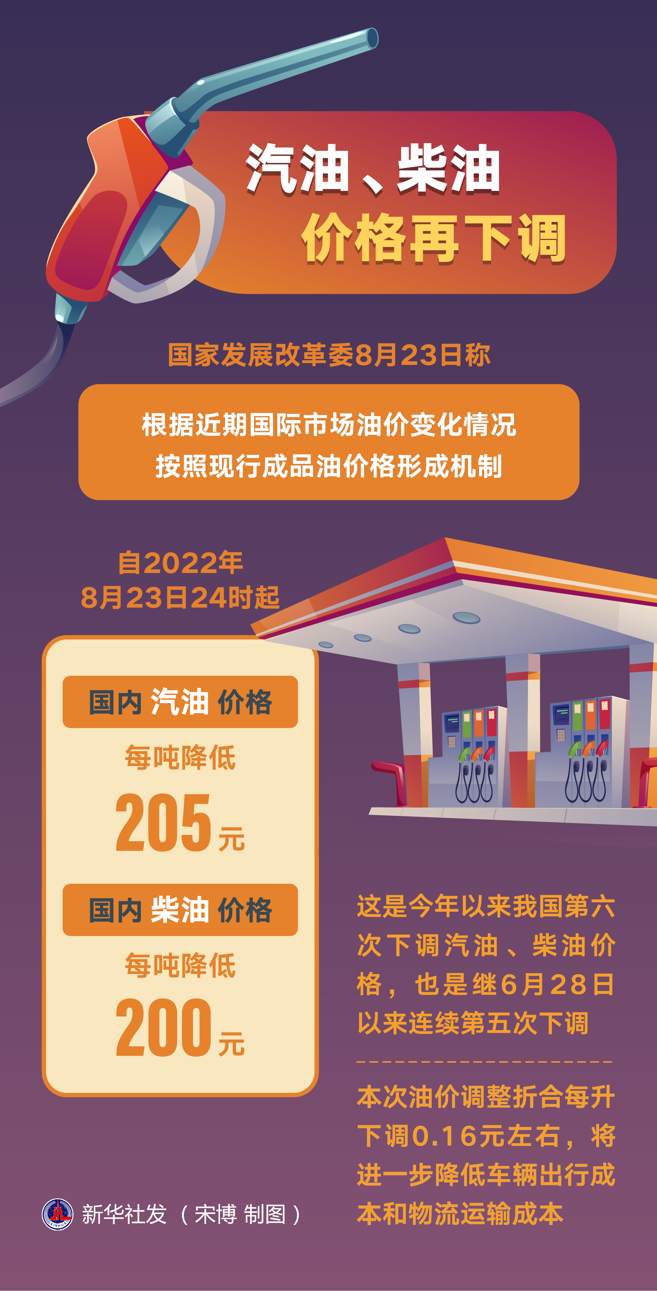 國(guó)家發(fā)展改革委8月23日稱(chēng),根據(jù)近期國(guó)際市場(chǎng)油價(jià)變化情況,按照現(xiàn)行成品油價(jià)格形成機(jī)制,自2022年8月23日24時(shí)起,國(guó)內(nèi)汽油、柴油價(jià)格每噸分別降低205元和200元。