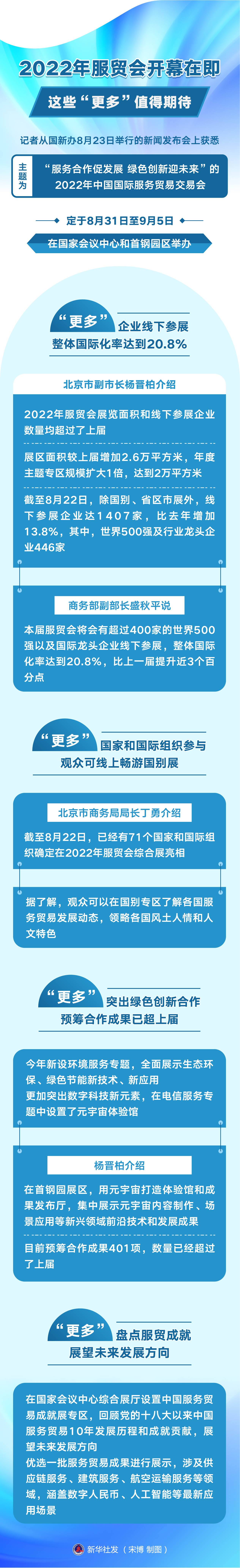 記者從國新辦8月23日舉行的新聞發(fā)布會上獲悉,主題為“服務(wù)合作促發(fā)展 綠色創(chuàng)新迎未來”的2022年中國國際服務(wù)貿(mào)易交易會定于8月31日至9月5日在國家會議中心和首鋼園區(qū)舉辦。從今年展會特點來看,展會規(guī)模及各方參與度進一步擴大,國際化和專業(yè)化水平進一步提升,組展辦會更加突出綠色創(chuàng)新合作,專區(qū)專館更加集中盤點十年服貿(mào)成就。