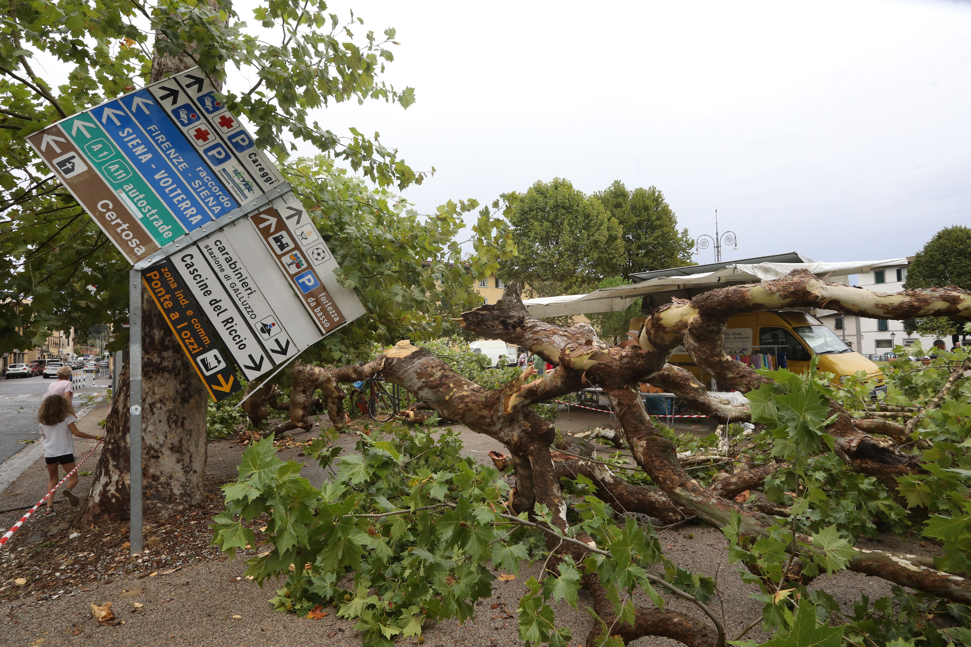 這是8月18日在意大利托斯卡納大區(qū)首府佛羅倫薩拍攝的被刮倒的樹木和路牌。