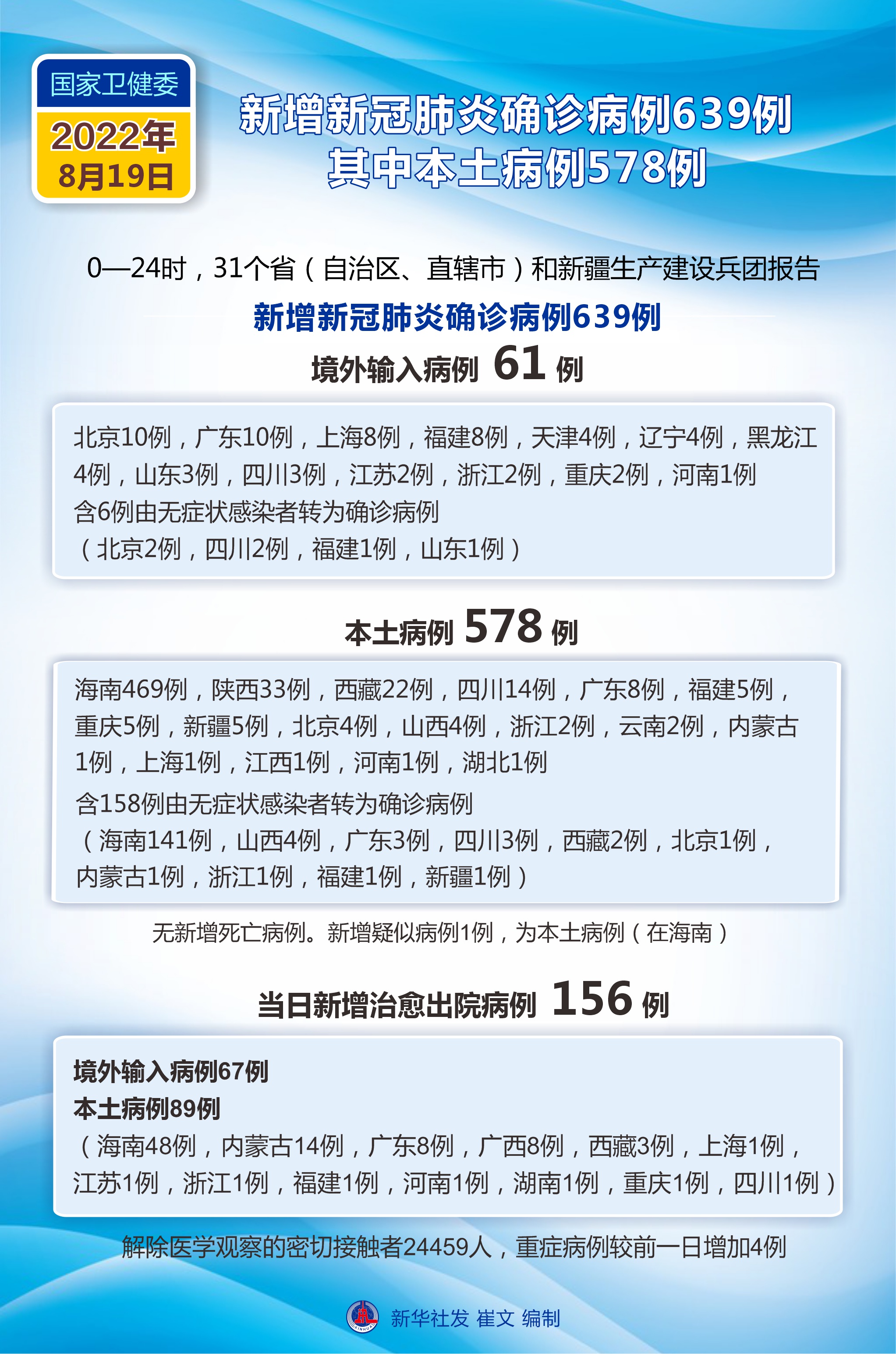 8月19日新增新冠肺炎確診病例639例 其中本土病例578例