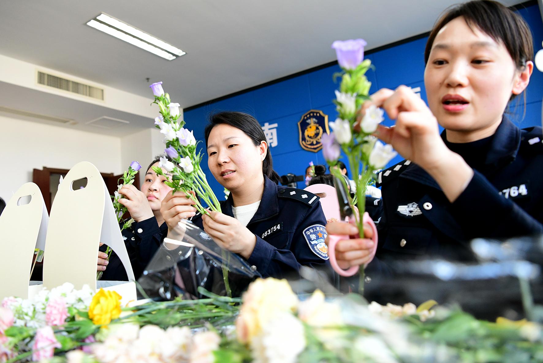 3月7日,安徽省阜南縣公安局女民輔警在花藝?yán)蠋煹闹笇?dǎo)下插花。為慶祝“三八”國(guó)際婦女節(jié),阜南縣公安局舉辦“學(xué)花藝 慶節(jié)日”活動(dòng)。