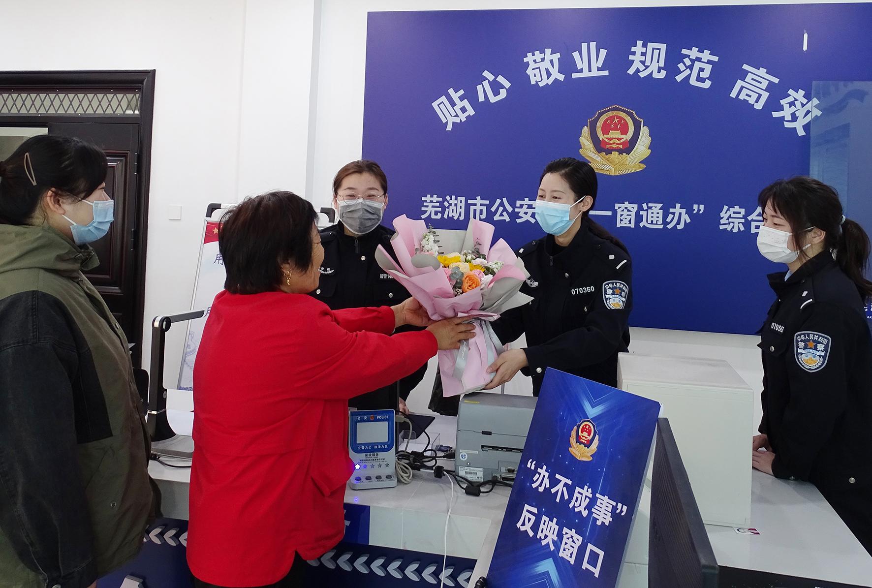 “你們辛苦啦!”3月8日,安徽省蕪湖市公安局鏡湖分局赭麓派出所戶籍室,群眾將鮮花獻(xiàn)給女民警、女輔警,向奮戰(zhàn)在一線的她們致以節(jié)日的問(wèn)候。