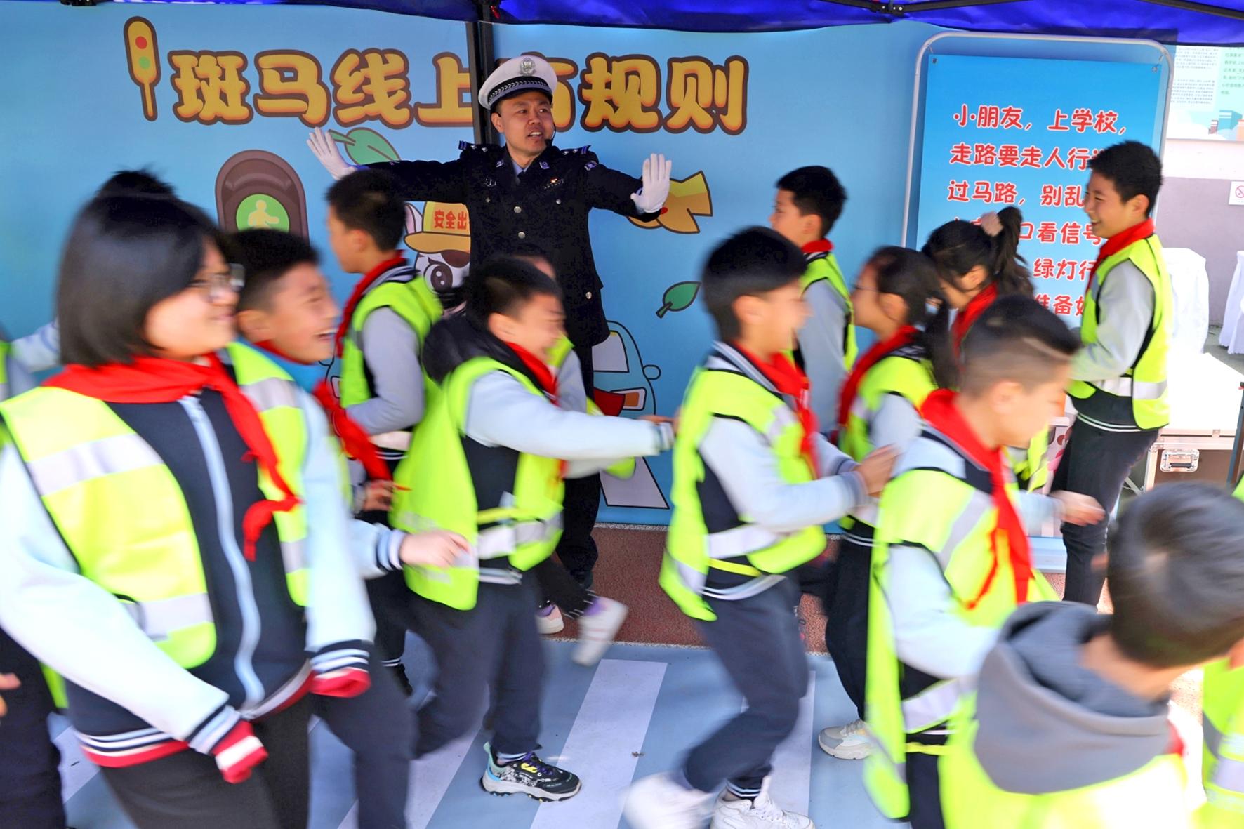 圖為民警帶學(xué)生沉浸式模擬體驗(yàn)安全通過(guò)十字路口。