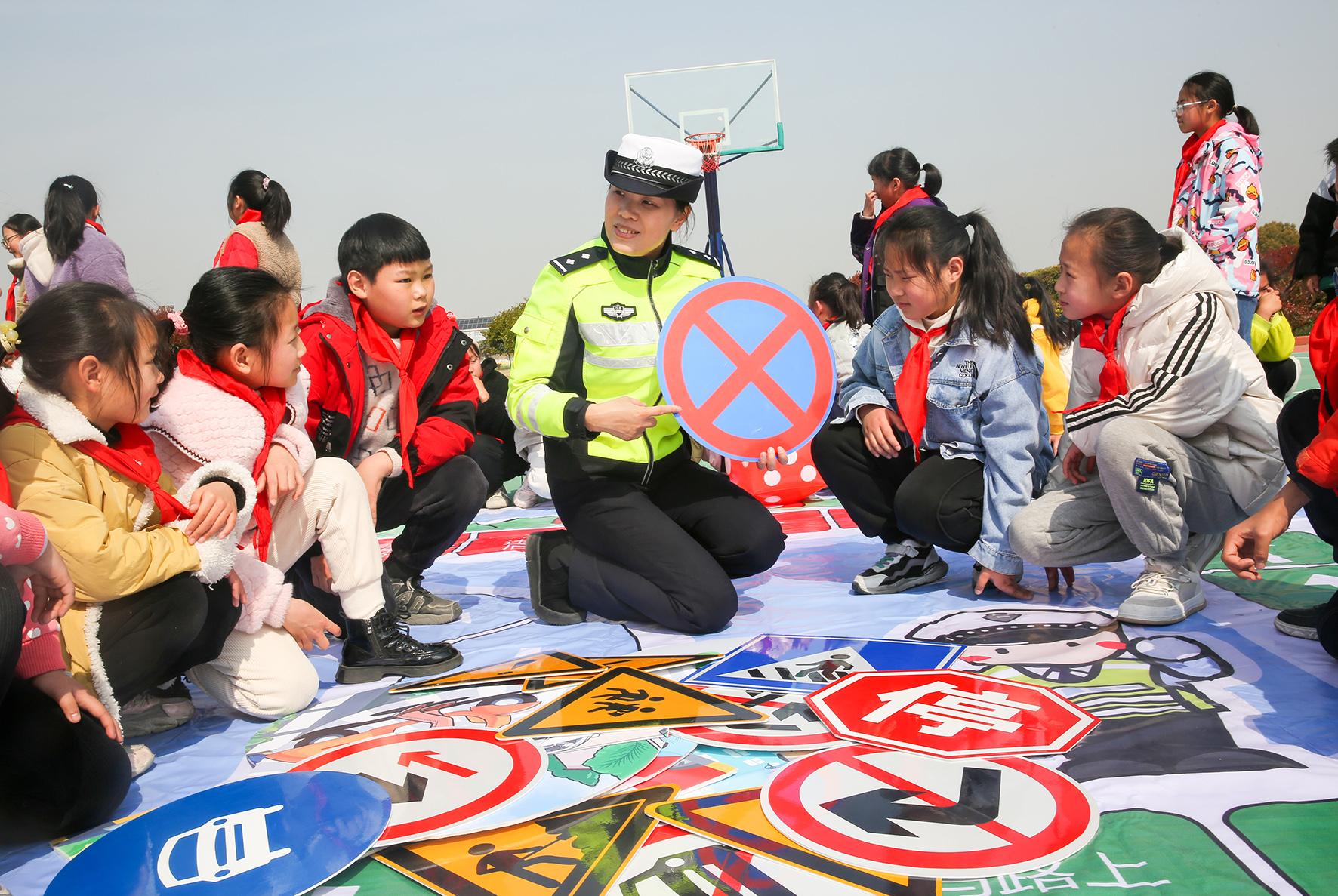 3月26日,安徽省阜南縣公安局交管大隊(duì)民警在黃崗鎮(zhèn)靳成學(xué)校與學(xué)生們互動(dòng)交通安全知識(shí)。