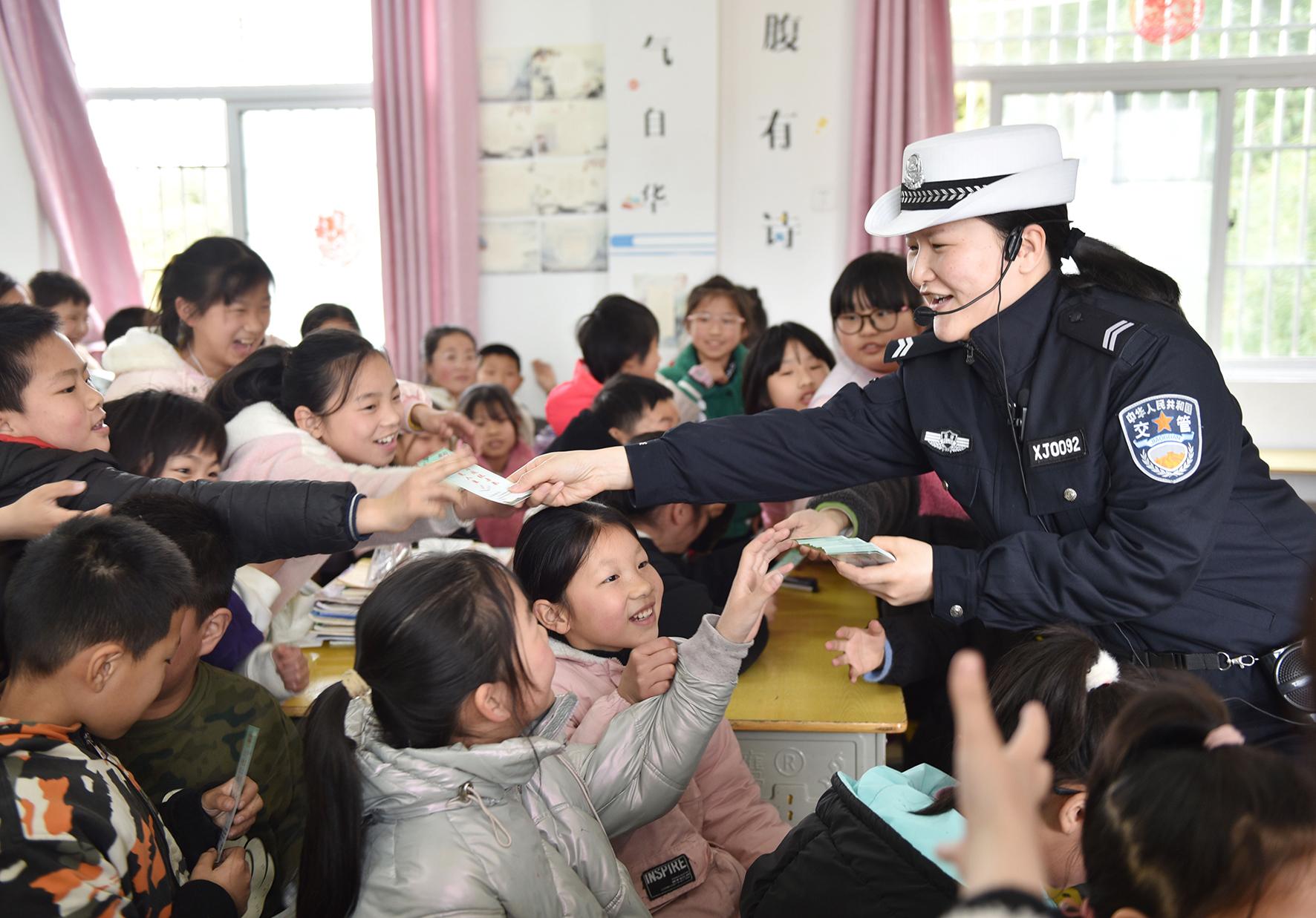 3月24日,安徽省宿松縣公安局交警大隊(duì)民輔警將自主設(shè)計(jì)制作的20000份交通安全書(shū)簽送到農(nóng)村學(xué)校學(xué)生手中。
