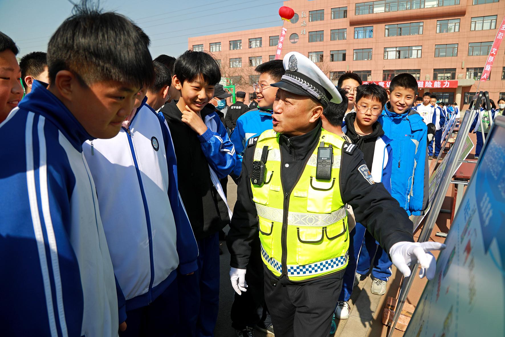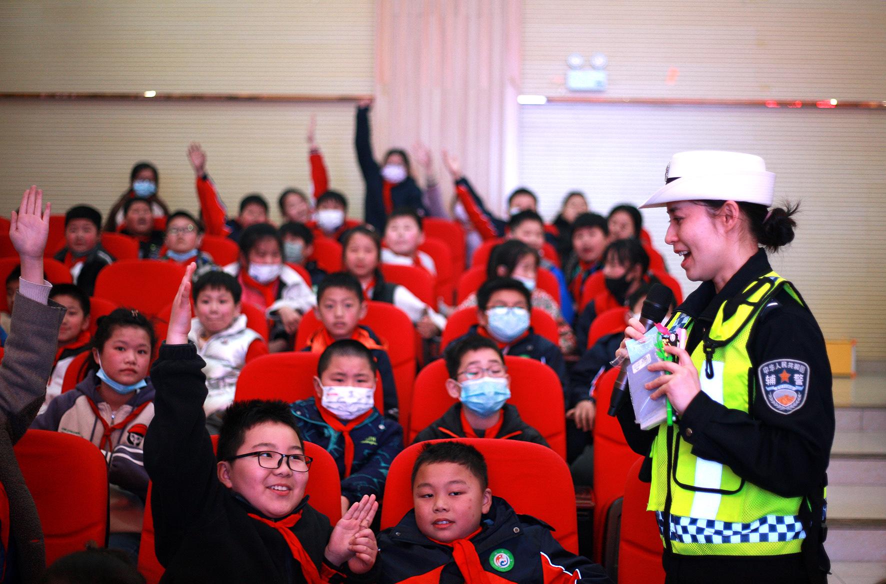 3月28日,遼寧省阜新市公安局交警支隊民警在“阜新市中小學生安全教育周啟動儀式暨太平區(qū)現場觀摩會”講解交通安全知識。