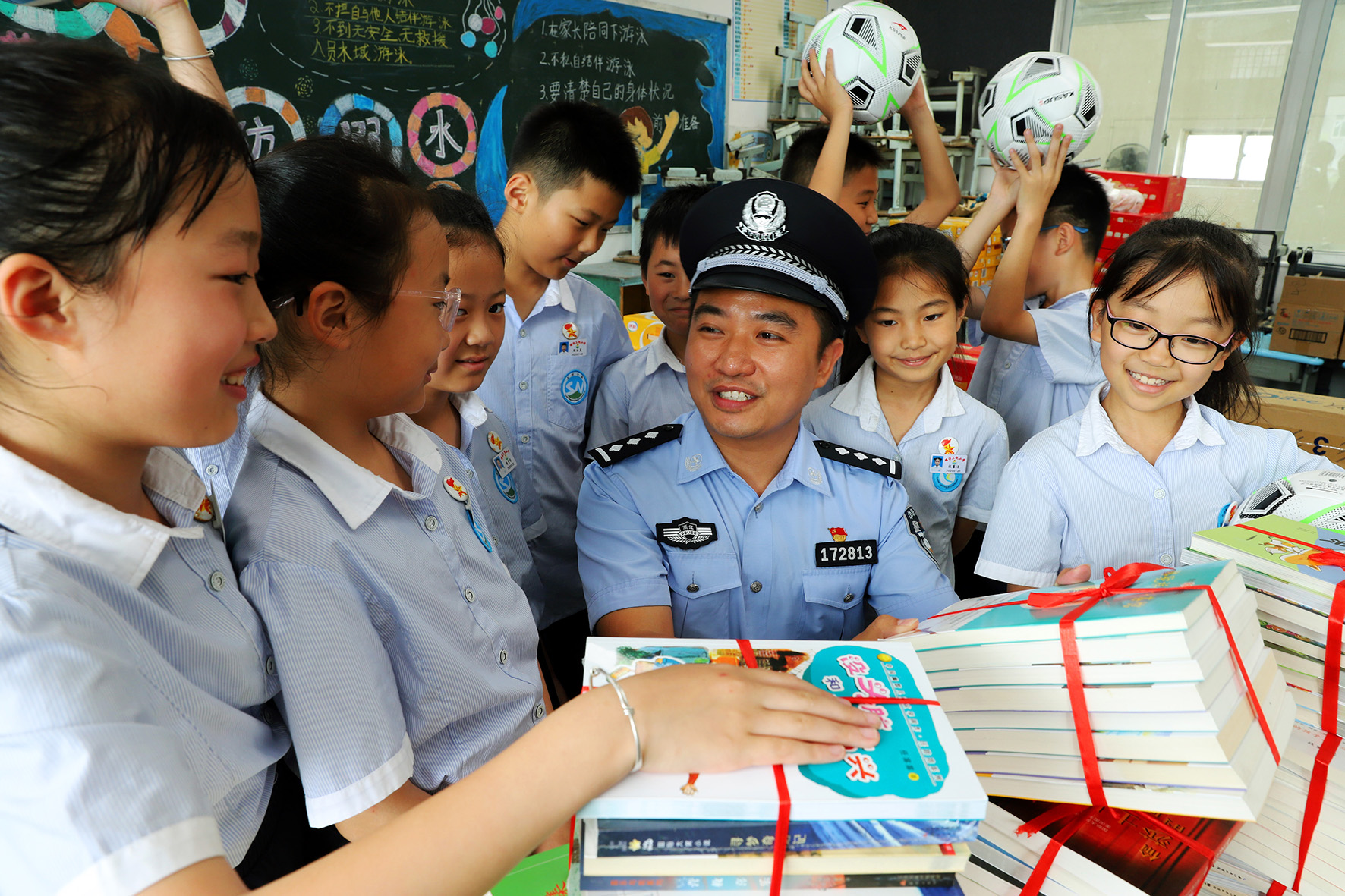 5月30日,浙江省臺(tái)州市路橋區(qū)螺洋派出所民警為上倪小學(xué)的同學(xué)們送去課外讀物、體育用品等節(jié)日禮物,并向同學(xué)們宣講夏季防溺水、防雷電知識(shí)。