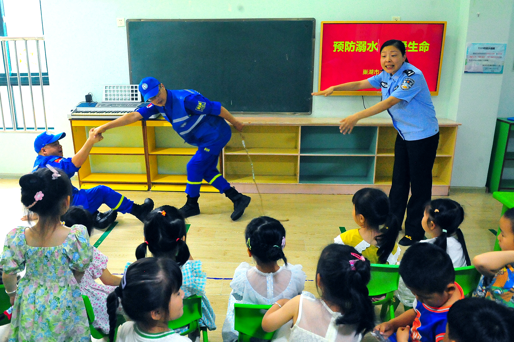 5月29日,安徽省巢湖市公安局臥牛派出所民警聯(lián)合藍(lán)天救援隊(duì)來到信泰幼兒園,為學(xué)生們宣講防溺水知識(shí)。
