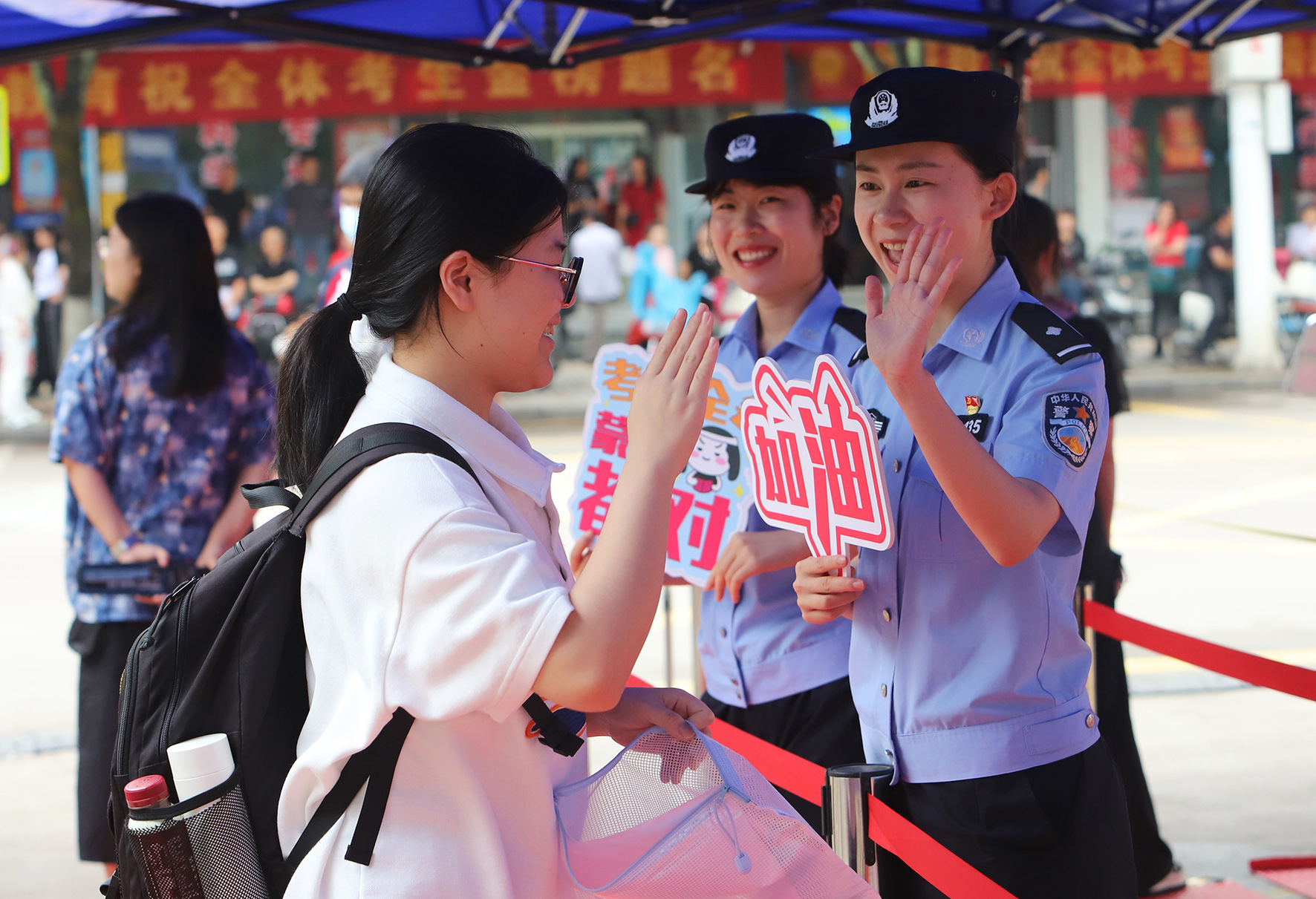 6月7日,在浙江省臺(tái)州市路橋中學(xué)考點(diǎn),現(xiàn)場(chǎng)執(zhí)勤的螺洋派出所民警為考生加油鼓勁。