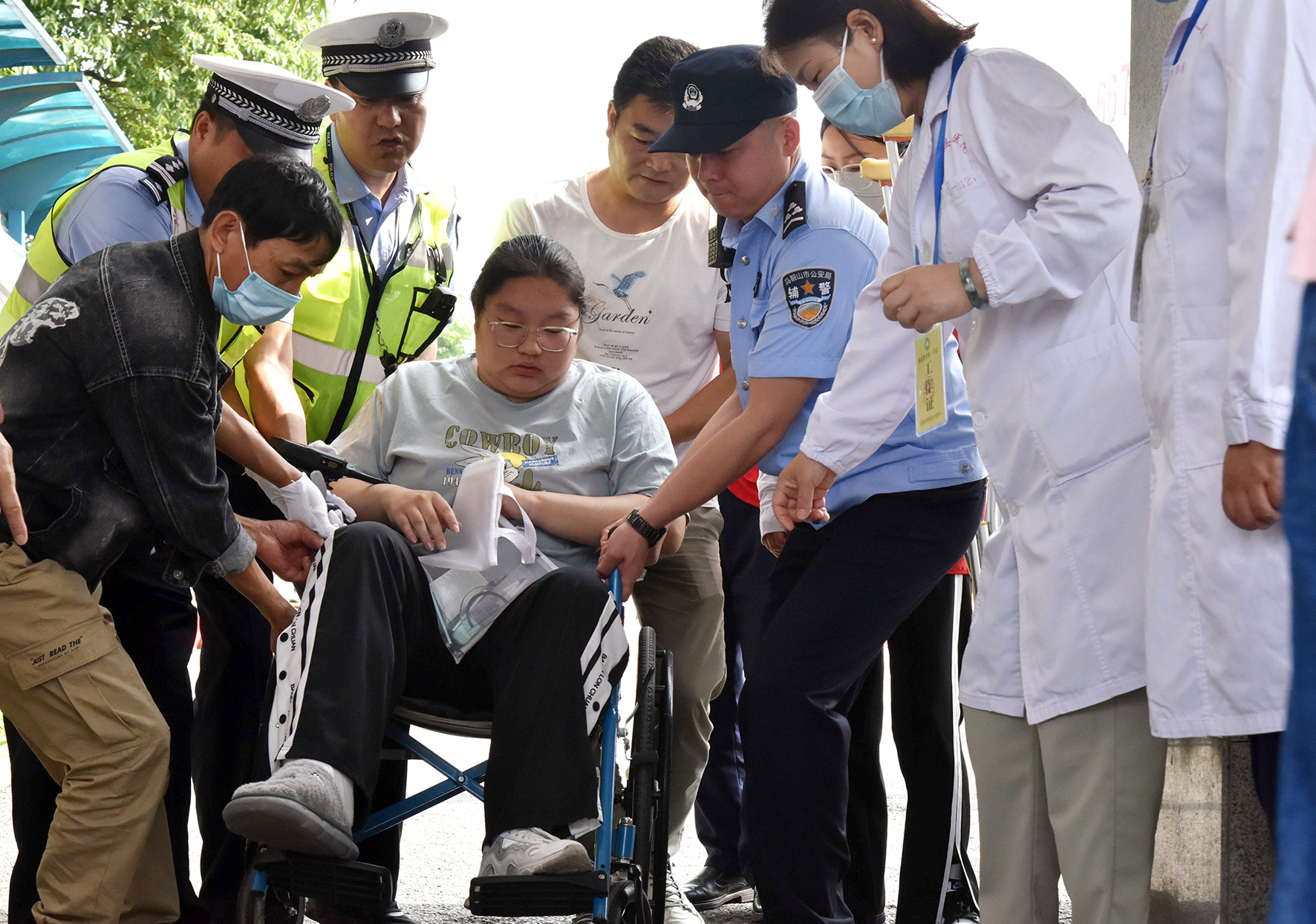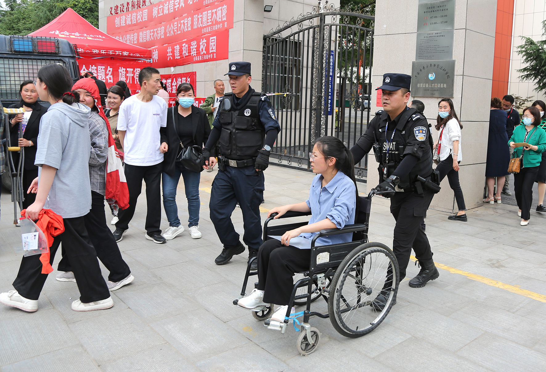 6月7日,安徽省當(dāng)涂縣公安局民警和志愿者幫助一名坐輪椅的考生進(jìn)入考場(chǎng)。