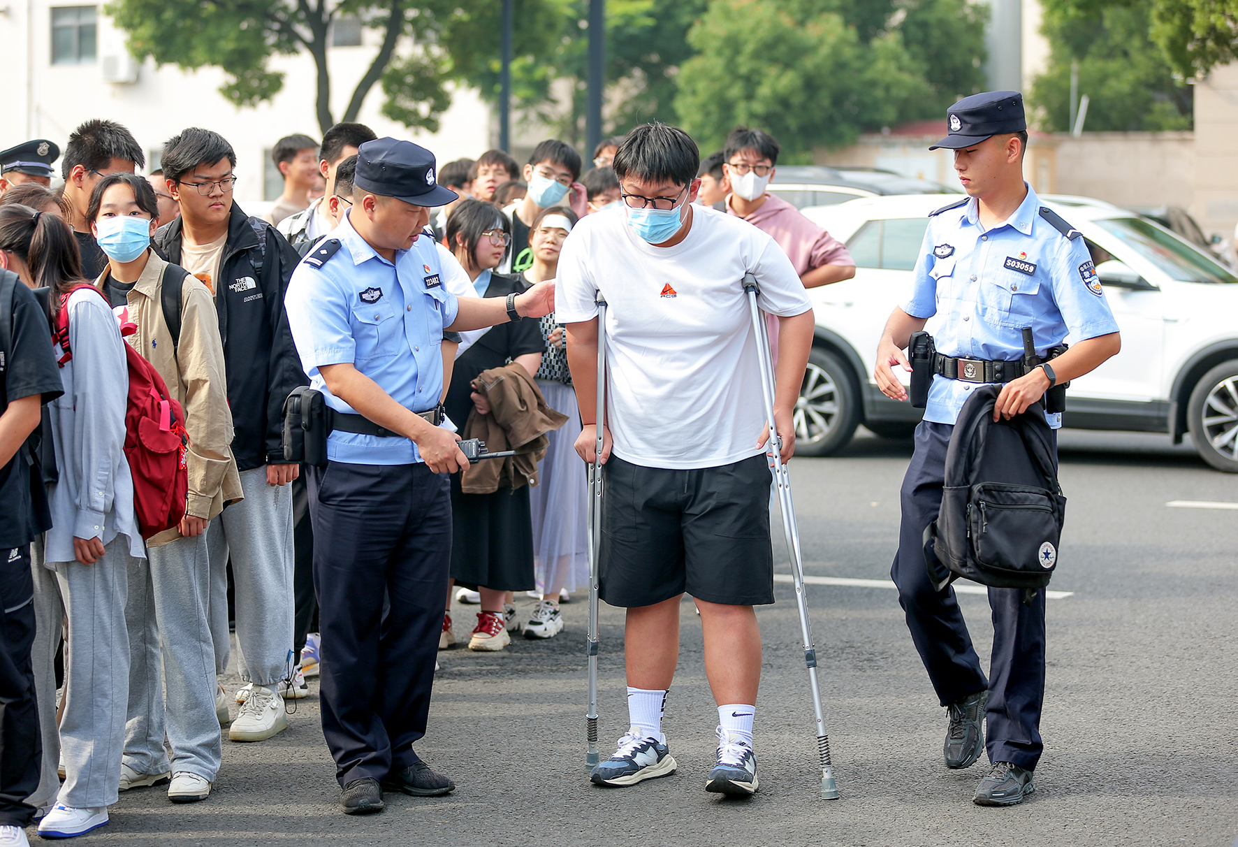 6月7日,江蘇省宜興市公安局民警護(hù)送行動(dòng)不便的考生進(jìn)入考點(diǎn)。