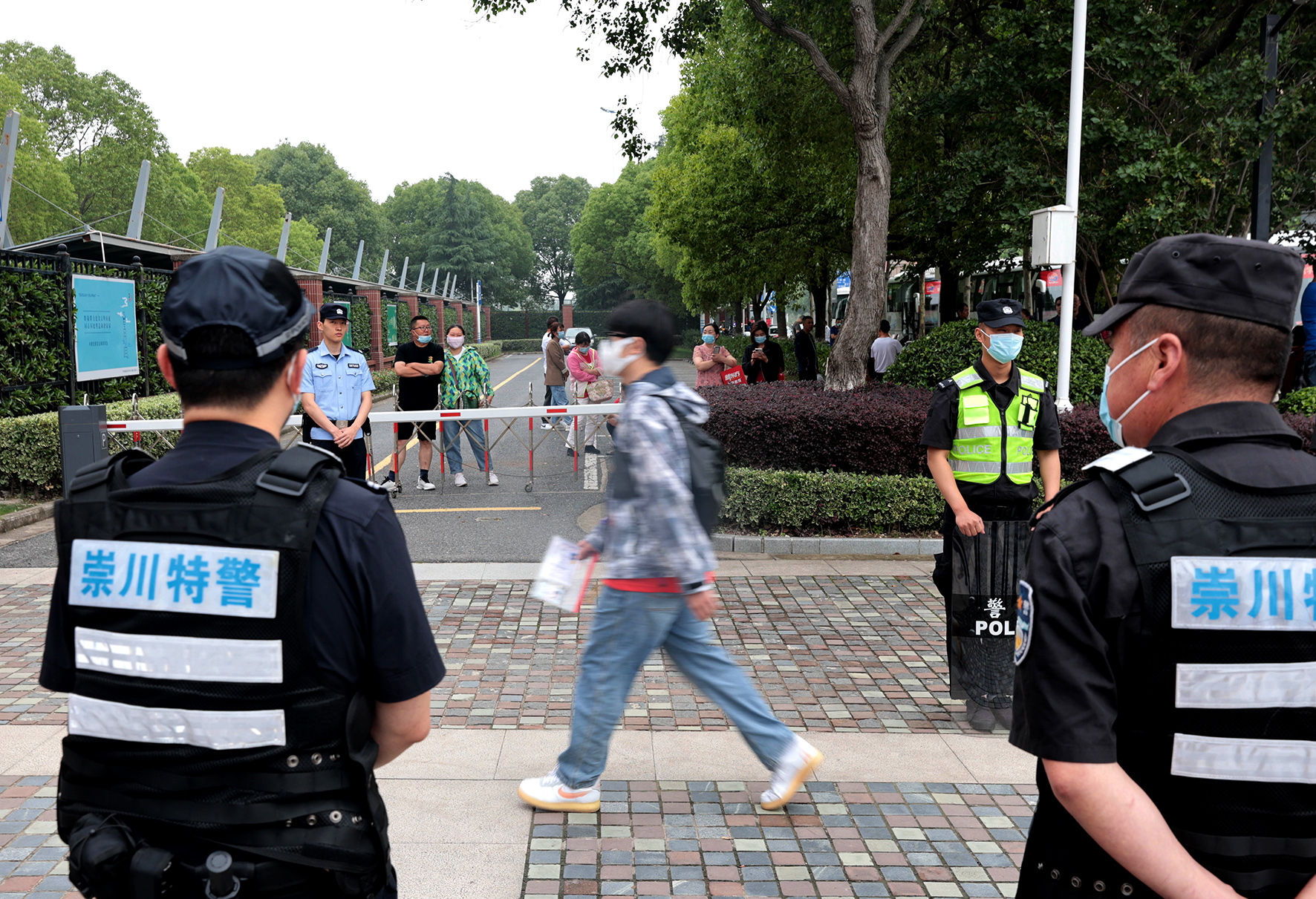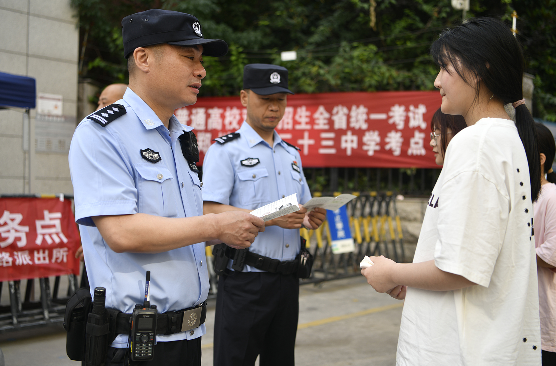 6月7日,河南省鄭州市公安局金水分局巡特警隊(duì)員及轄區(qū)派出所民輔警在考場(chǎng)入口處護(hù)航高考服務(wù)考生和家長(zhǎng)。