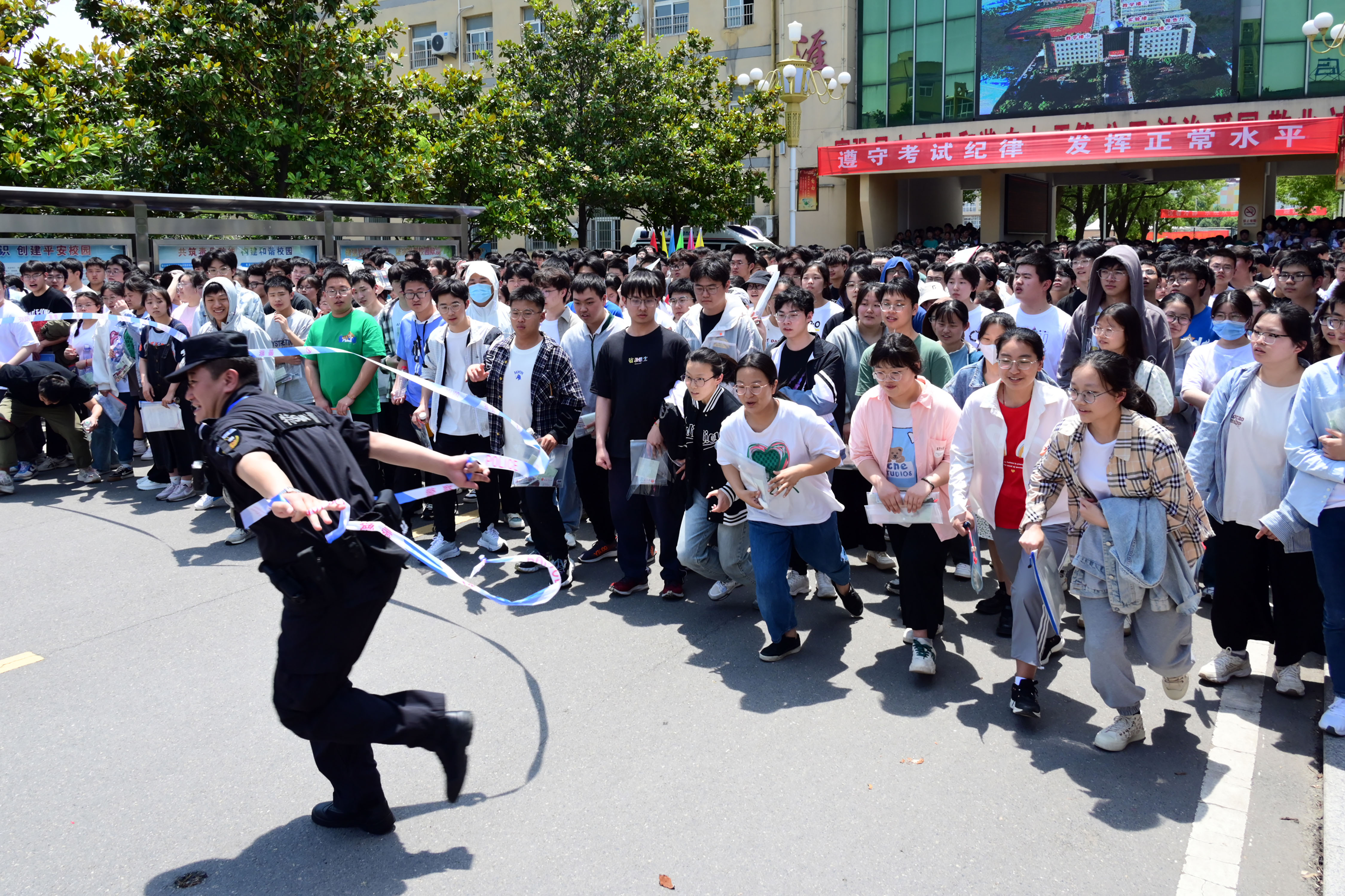 6月7日,安徽固鎮(zhèn)縣高考首場(chǎng)語文考試結(jié)束,實(shí)驗(yàn)中學(xué)考點(diǎn)執(zhí)勤民警解除警戒線后考生沖出考場(chǎng)。