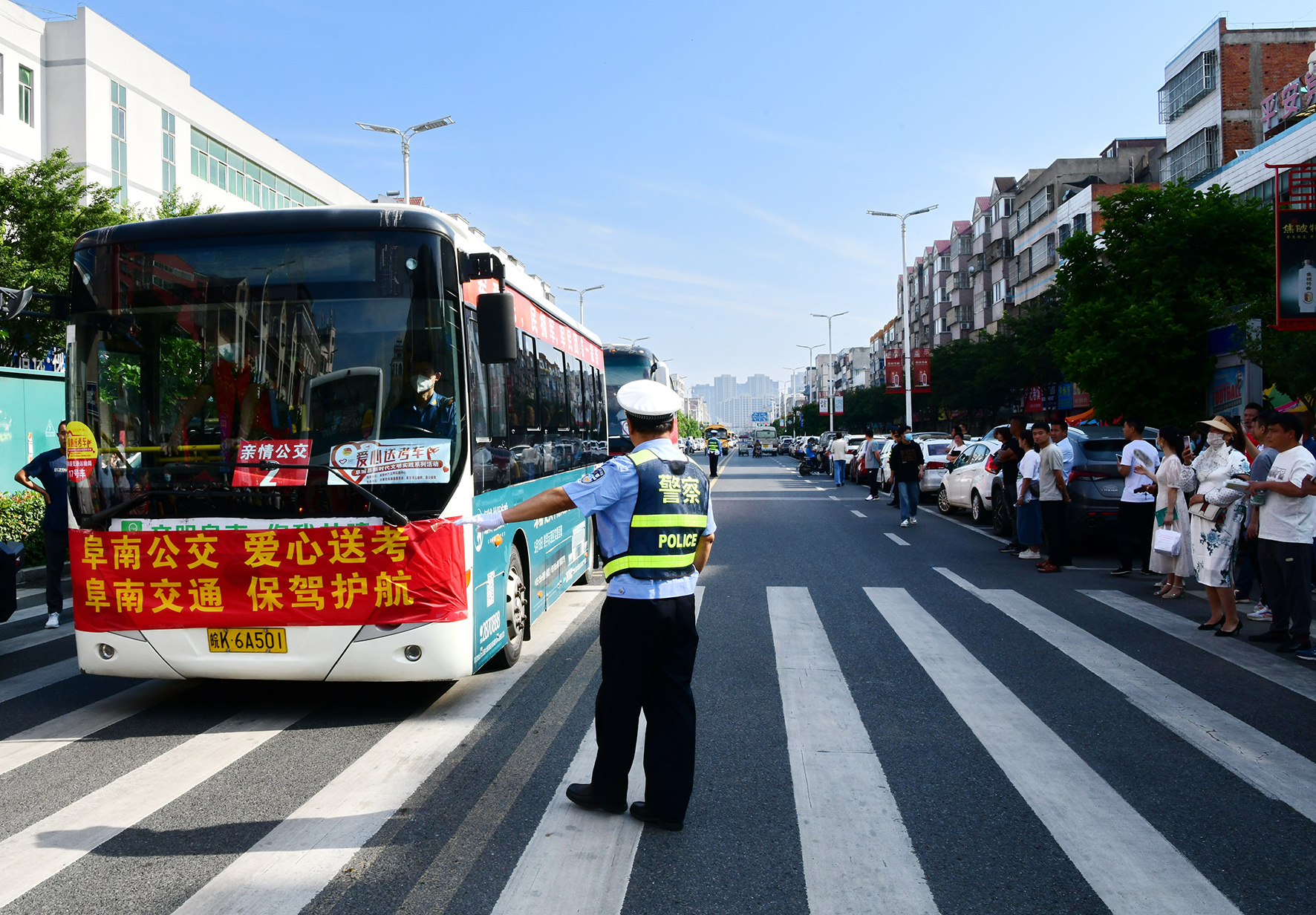 6月7日,安徽省阜南縣公安局組織交巡警、治安民警等警種在4個(gè)高考點(diǎn)周邊路段維持交通和治安秩序,同時(shí)還為考生做好應(yīng)急服務(wù)工作。