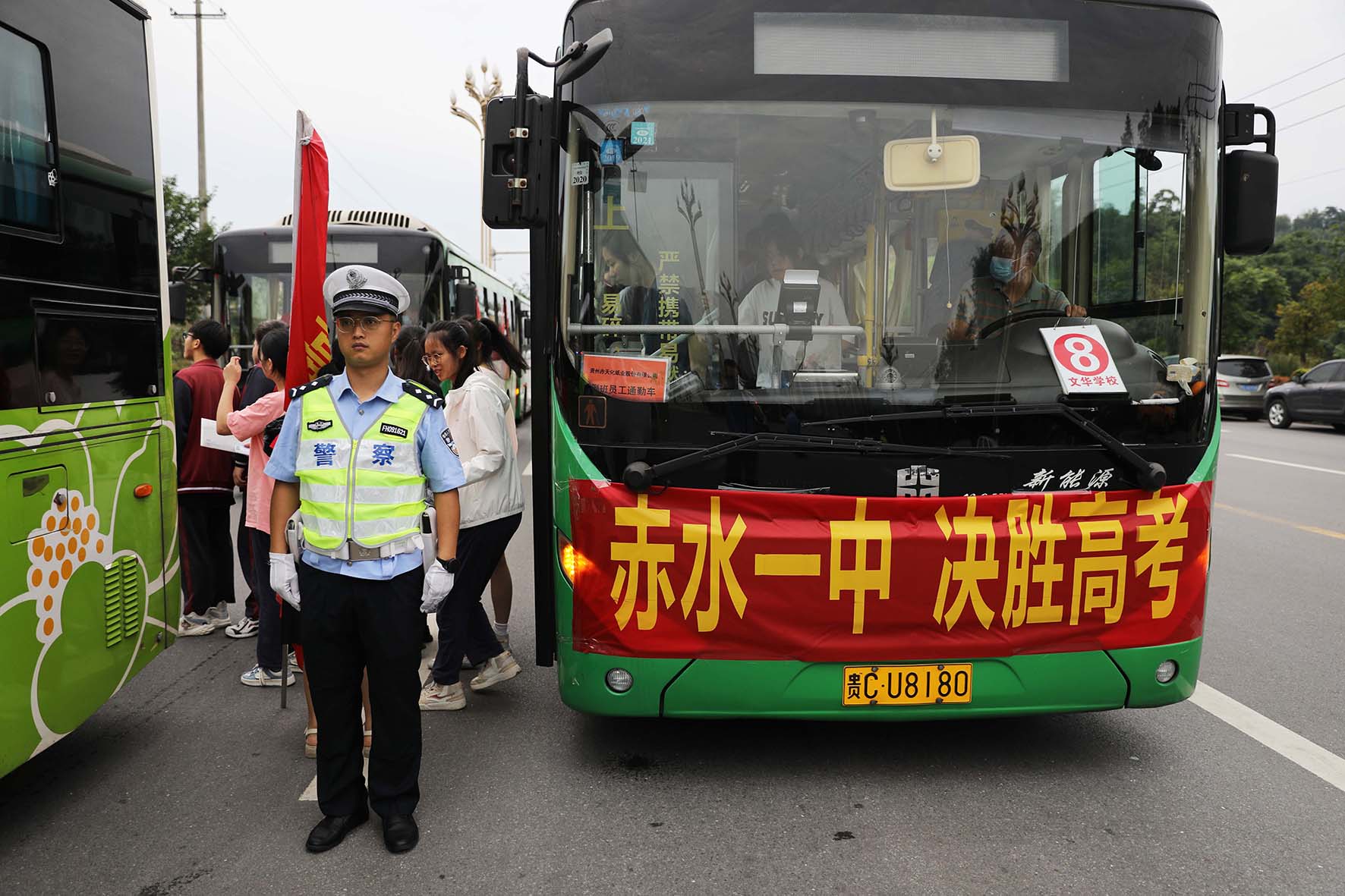 6月7日,貴州省赤水市公安局民警在第三中學(xué)考點(diǎn)現(xiàn)場(chǎng)維持秩序。