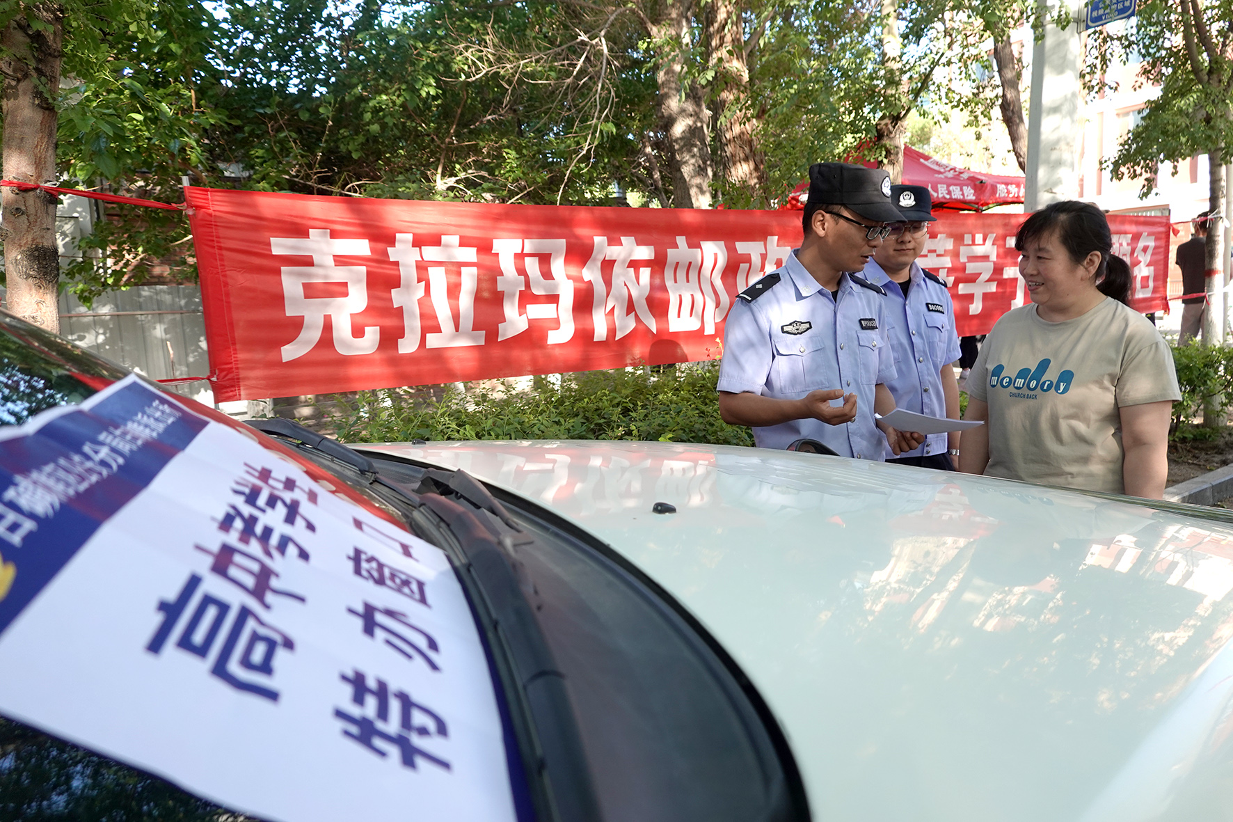 6月7日,新疆克拉瑪依市公安局白堿灘區(qū)分局民警給考生家長(zhǎng)耐心解答特辦窗口業(yè)務(wù)流程。