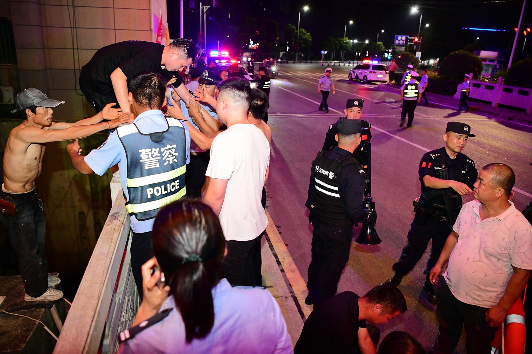 7月7日夜,安徽省阜南縣公安局城西派出所民警與群眾合力將一名落水男子救上岸。