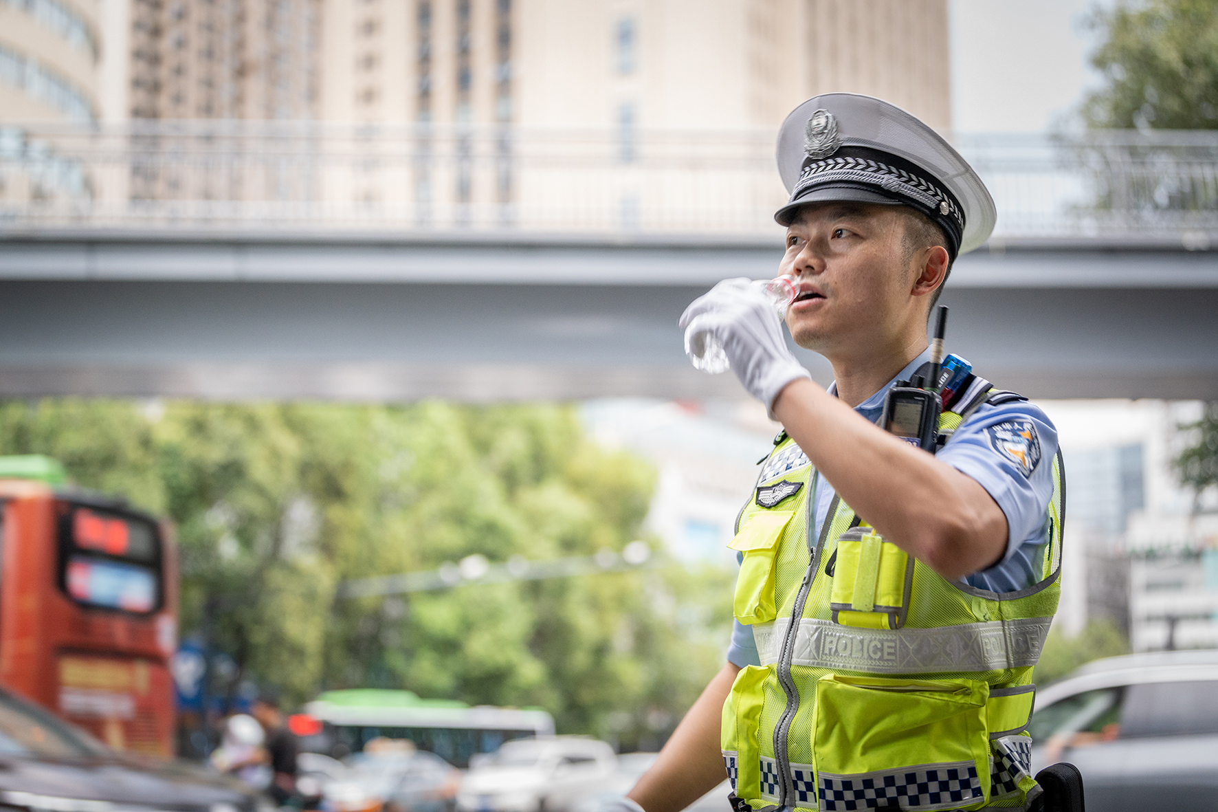 8月8日,四川省綿陽(yáng)市出現(xiàn)34℃高溫天氣。綿陽(yáng)市公安局交警直屬一大隊(duì)民警堅(jiān)守路面,冒高溫指揮疏導(dǎo)交通,確保道路安全暢通。