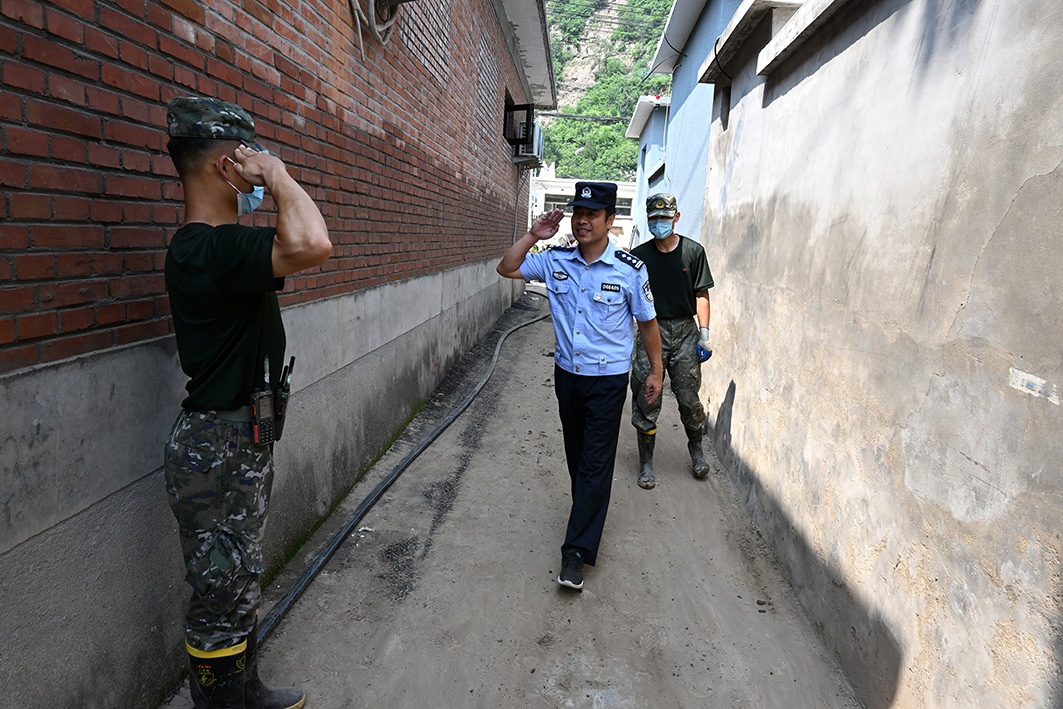 在一片忙碌中,“警察藍”格外顯眼。這一天,受災被淹的十渡鎮(zhèn)派出所終于搬入了條件好一些的臨時辦公點,民警們也換上了剛剛從派出所“搶救”出來的警服,開啟了常規(guī)工作模式。