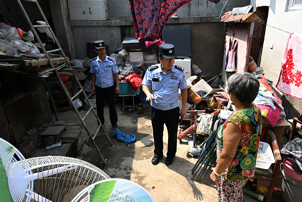 社區(qū)民警張宗雷(中)和張春江(左一)第一時間到受災村民家中了解情況。