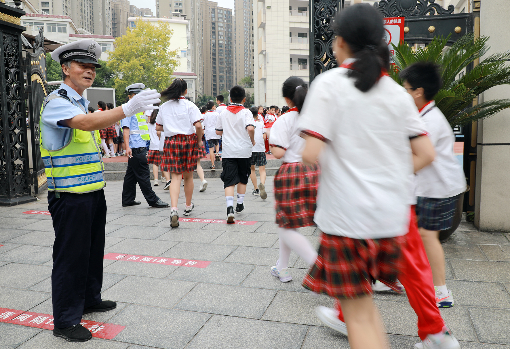 9月1日,江西省九江市公安局交管支隊(duì)第一大隊(duì)執(zhí)勤輔警在轄區(qū)湖濱小學(xué)門口護(hù)送小學(xué)生們安全進(jìn)入校園。
