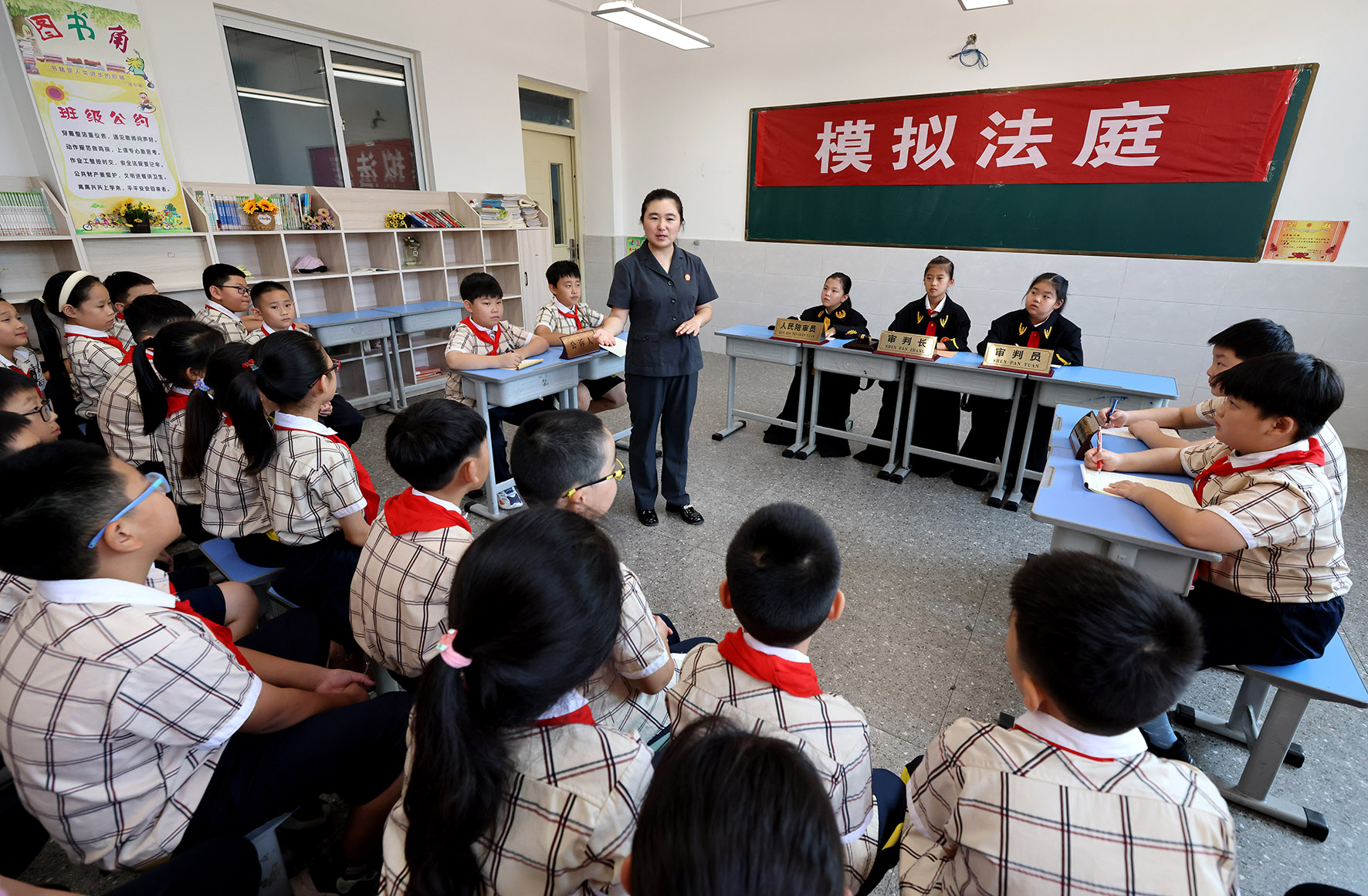 9月1日,山東省棗莊市市中區(qū)人民法院法官在東湖小學(xué)給學(xué)生們講解模擬法庭的“庭審”程序。當(dāng)日,棗莊市市中區(qū)人民法院組織法官走進(jìn)校園,為學(xué)生上好新學(xué)期法治教育第一課。