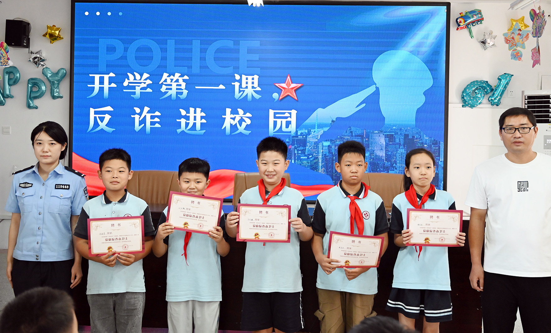 9月1日,山東省棗莊市公安局高新分局興城派出所民警走進(jìn)轄區(qū)興城中心小學(xué)舉行“家庭反詐小衛(wèi)士”聘任儀式,為156名學(xué)生傳授反詐知識(shí),頒發(fā)了“家庭反詐小衛(wèi)士”聘書。