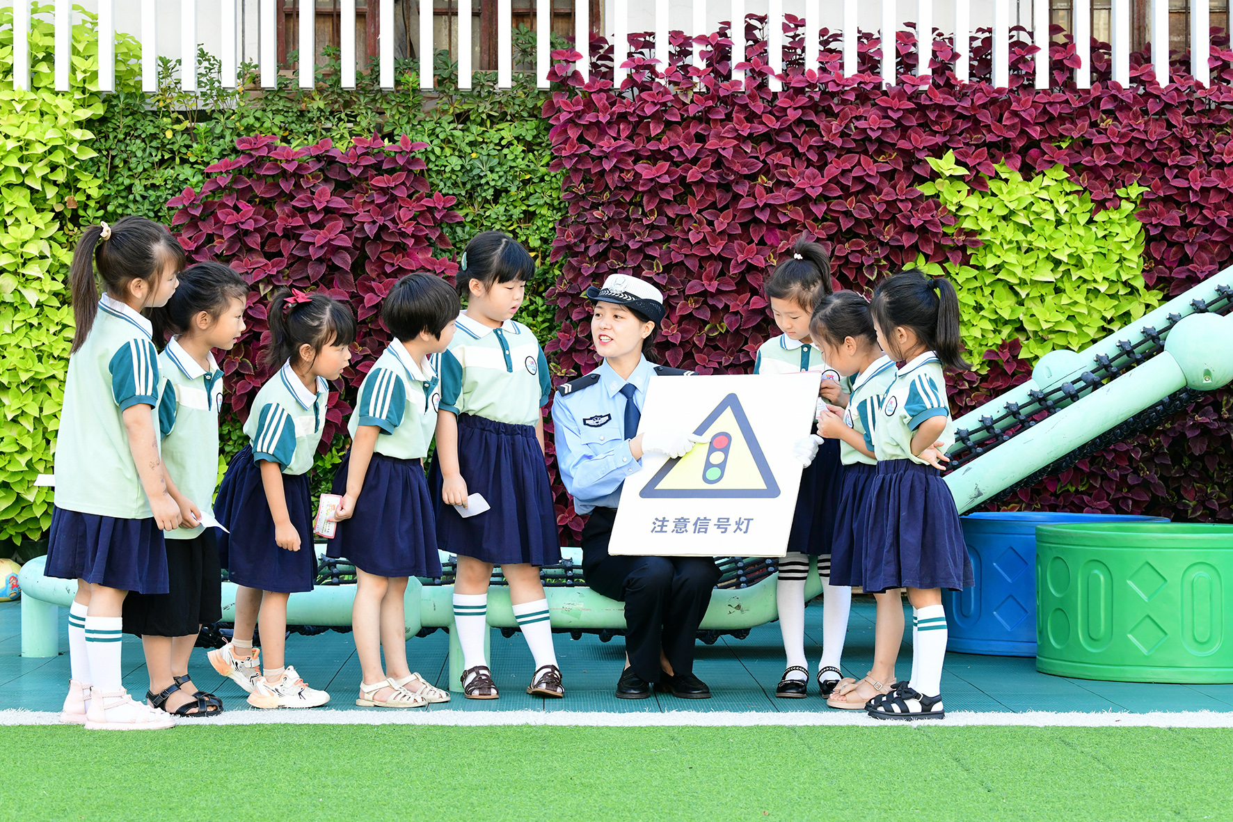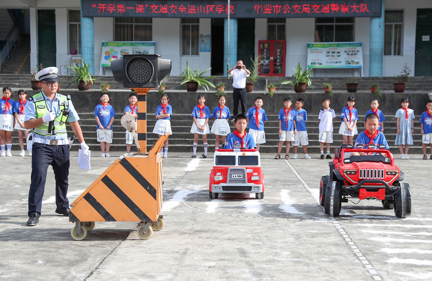 9月1日, 四川省華鎣市公安局交通警察大隊(duì)組織民警, 攜帶紅綠燈具、模型車、交通安全標(biāo)識(shí)牌等來到天池鎮(zhèn)小學(xué),開展體驗(yàn)式交通安全教育。