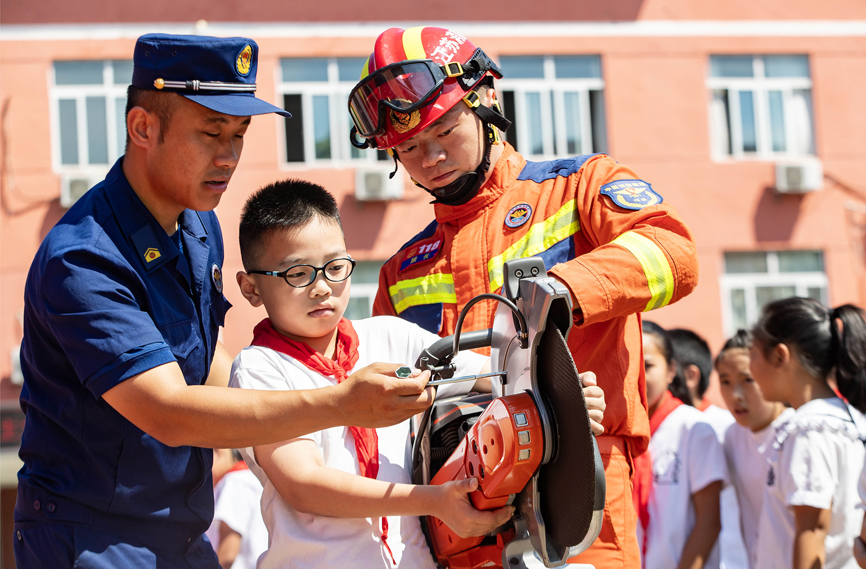 圖為消防救援隊(duì)員在克強(qiáng)學(xué)校指導(dǎo)學(xué)生使用消防救援設(shè)備。