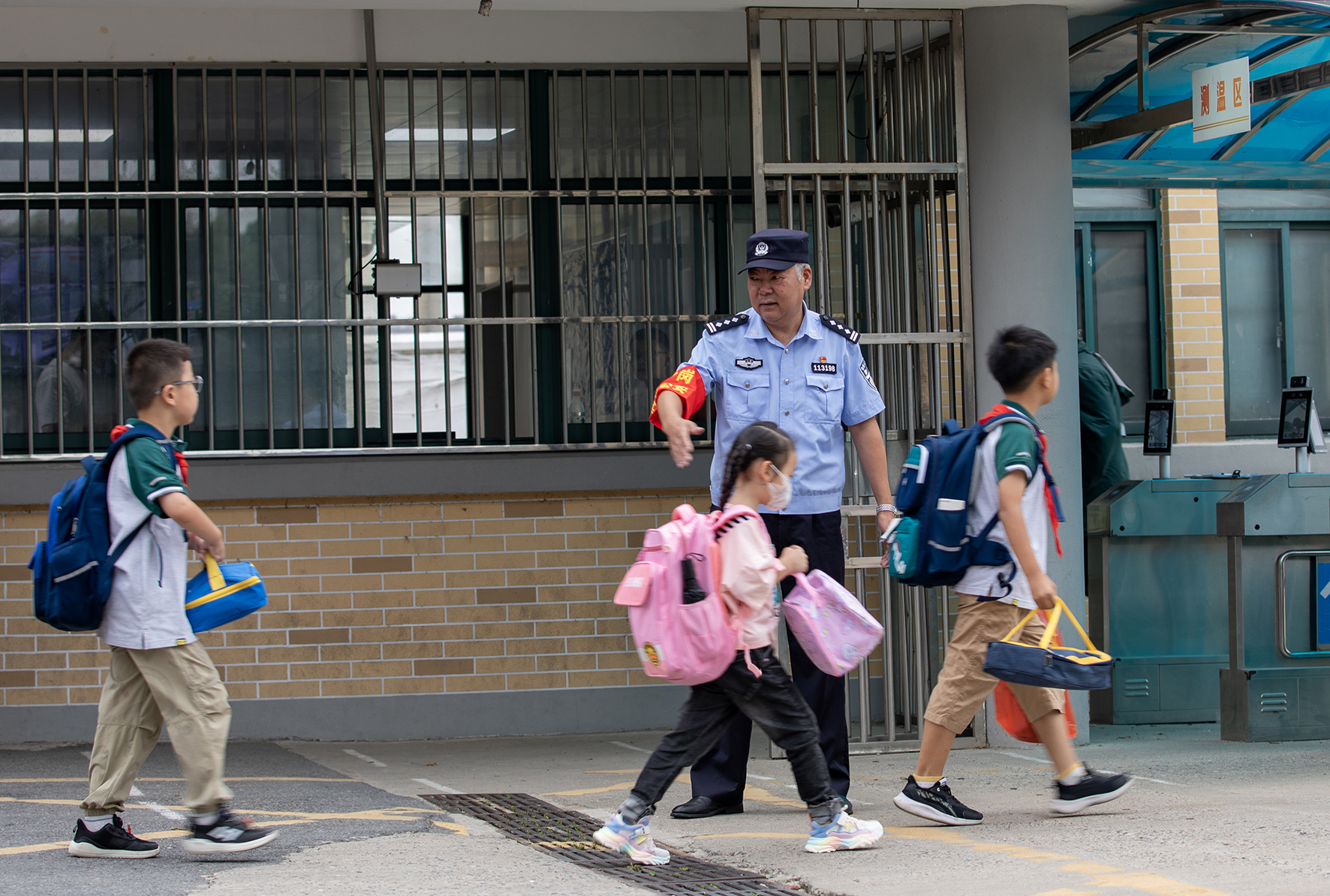 9月4日,江蘇省鎮(zhèn)江市公安局潤州分局蔣喬派出所護(hù)學(xué)崗民警在金山實(shí)驗(yàn)學(xué)校門口執(zhí)勤。