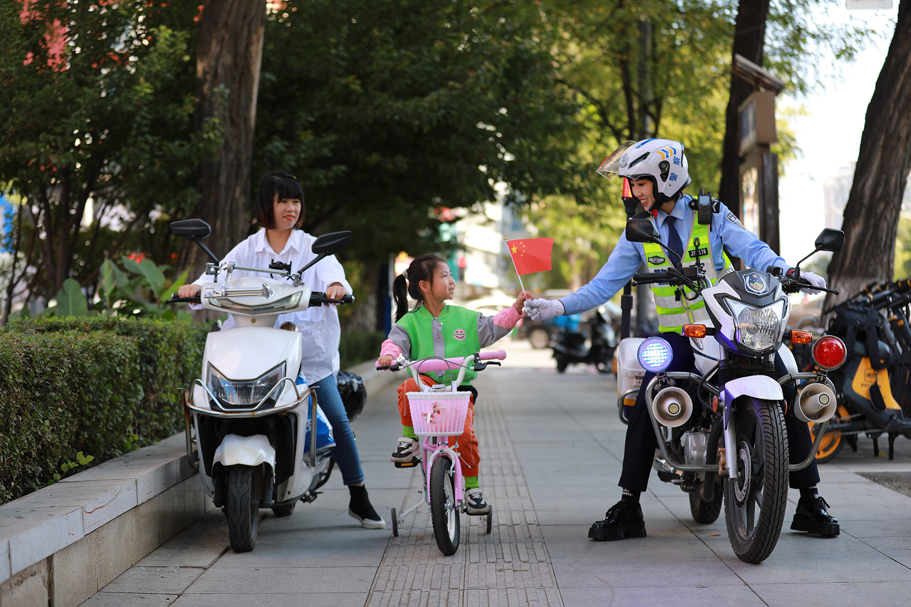 10月5日,遼寧省阜新市公安局交警支隊海州大隊女子騎警隊民警加強節(jié)日執(zhí)勤,叮囑小朋友注意騎行安全。