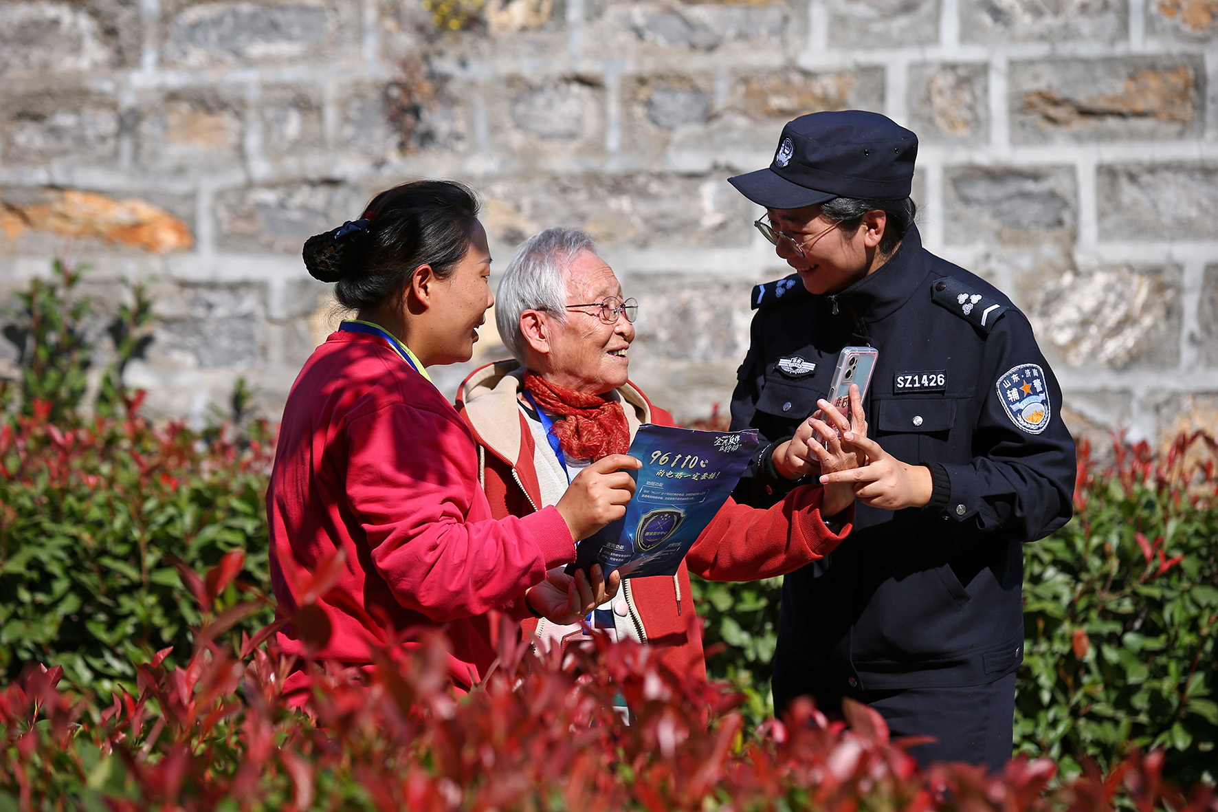 10月22日,山東濟南養(yǎng)老服務中心,濟南市公安局市中區(qū)分局十六里河派出所輔警正在對老人進行反電詐宣傳教育。