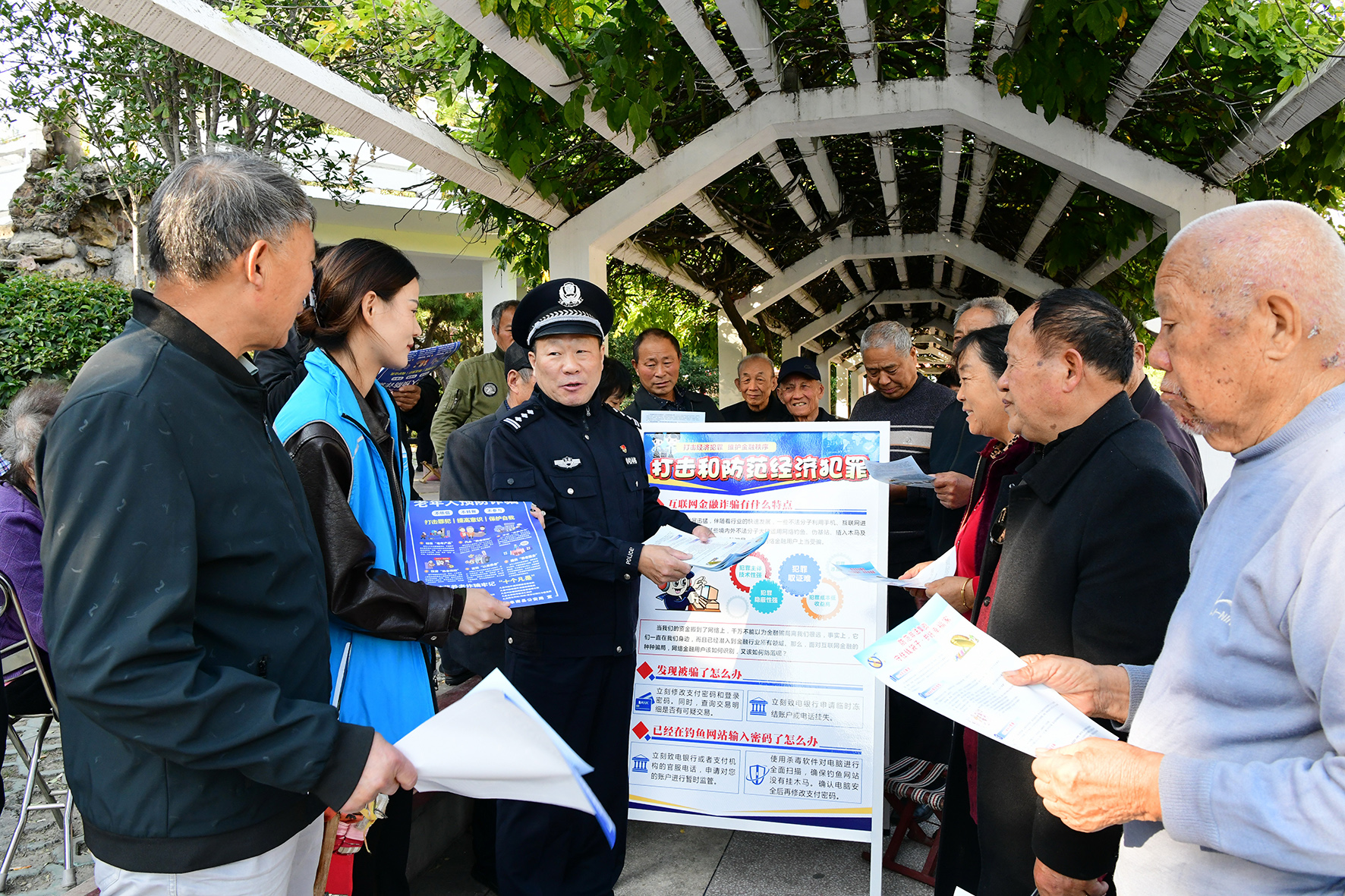 10月23日,安徽省阜南縣公安局民警在街心公園向老人們宣講防范養(yǎng)老詐騙知識。