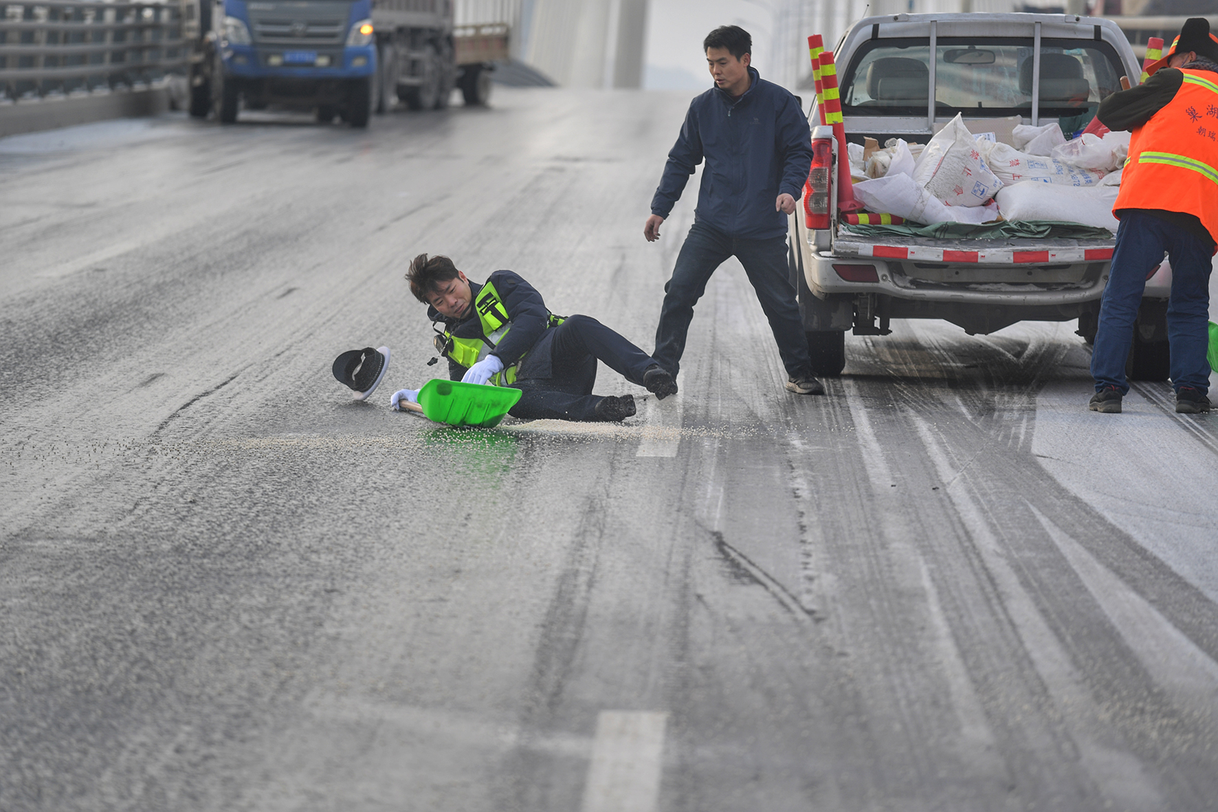 12月16日,安徽省巢湖市公安局交警大隊(duì)民警在巢湖大橋撒鹽除冰時(shí)因路面濕滑不慎摔倒在地。