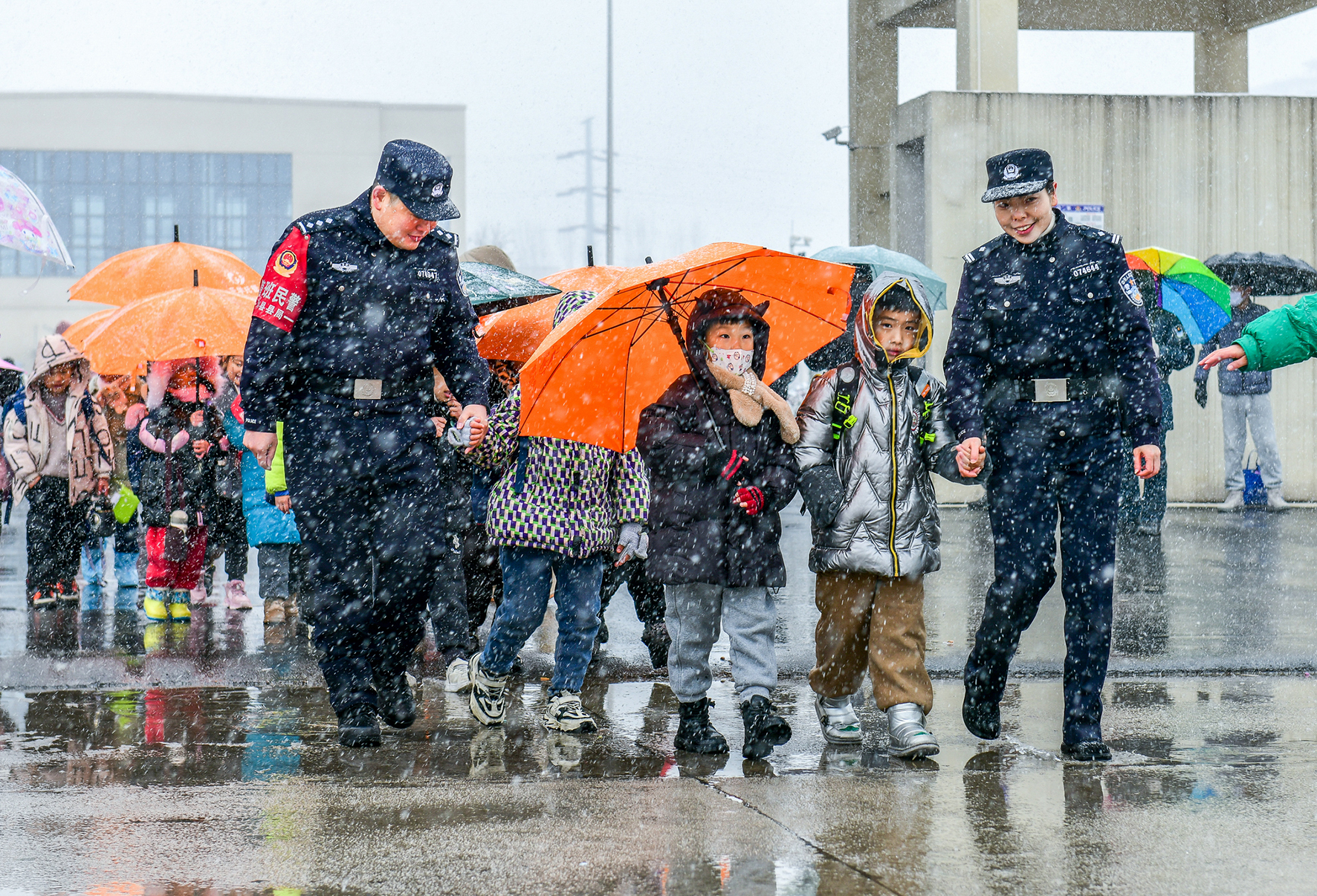12月18日,安徽省馬鞍山市和縣公安局護(hù)學(xué)崗民警正在護(hù)送學(xué)生安全放學(xué)。