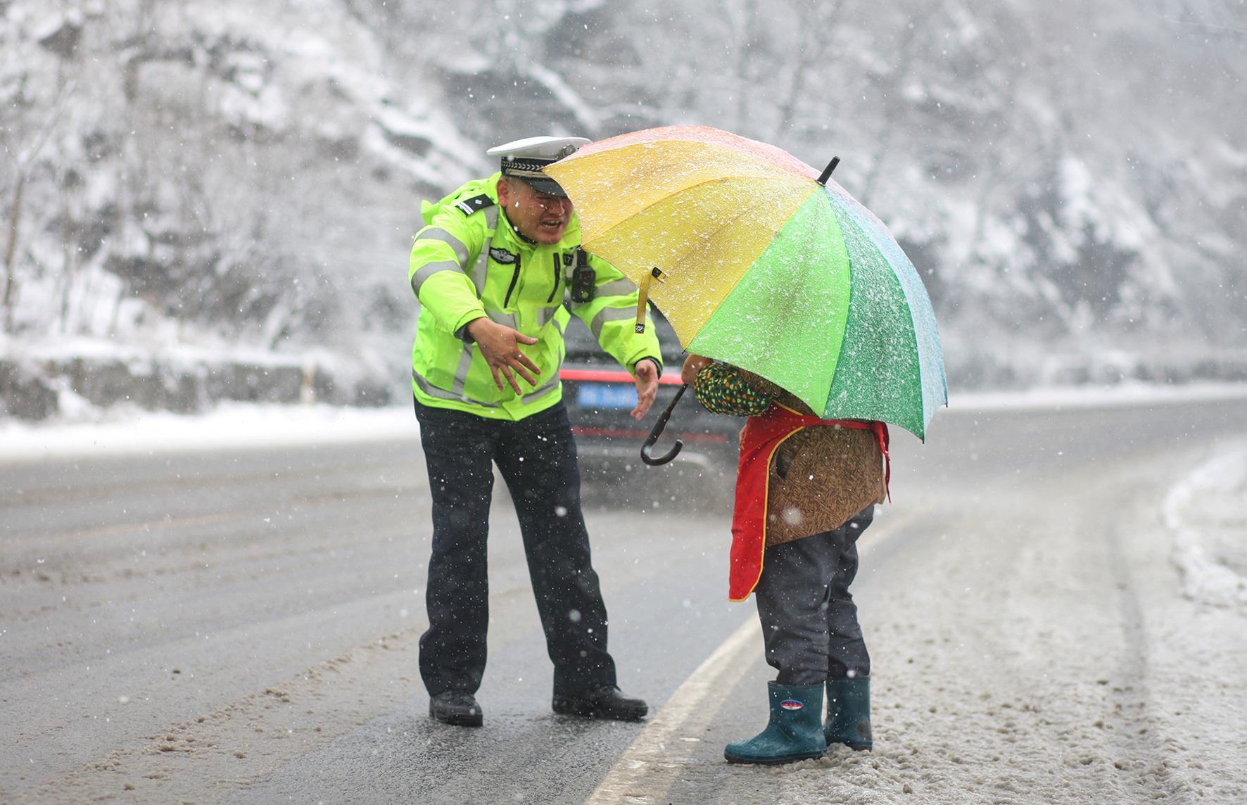 12月18日,安徽省巢湖市公安局交警大隊(duì)民警提示一名老年人雪天過馬路注意交通安全,并將其安全護(hù)送過馬路。