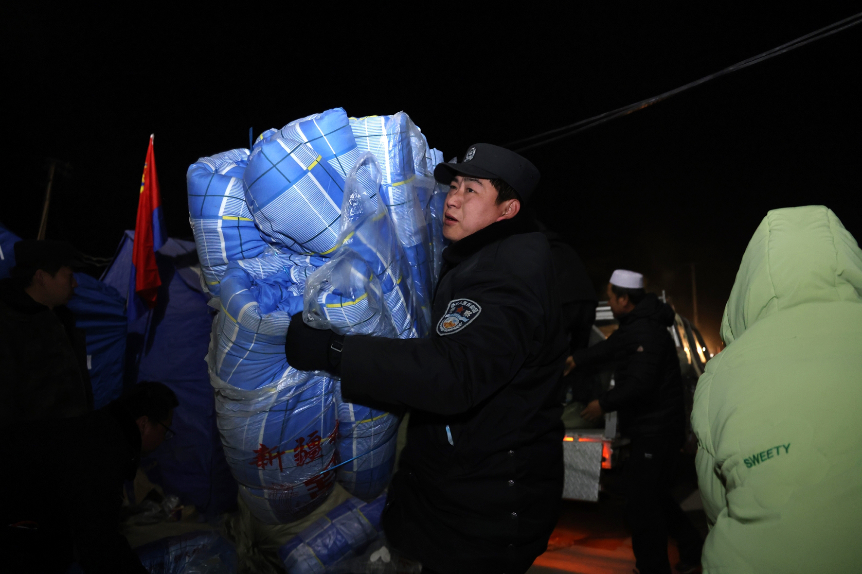 圖三:12月20日22時許,民輔警搬運救災(zāi)物資。