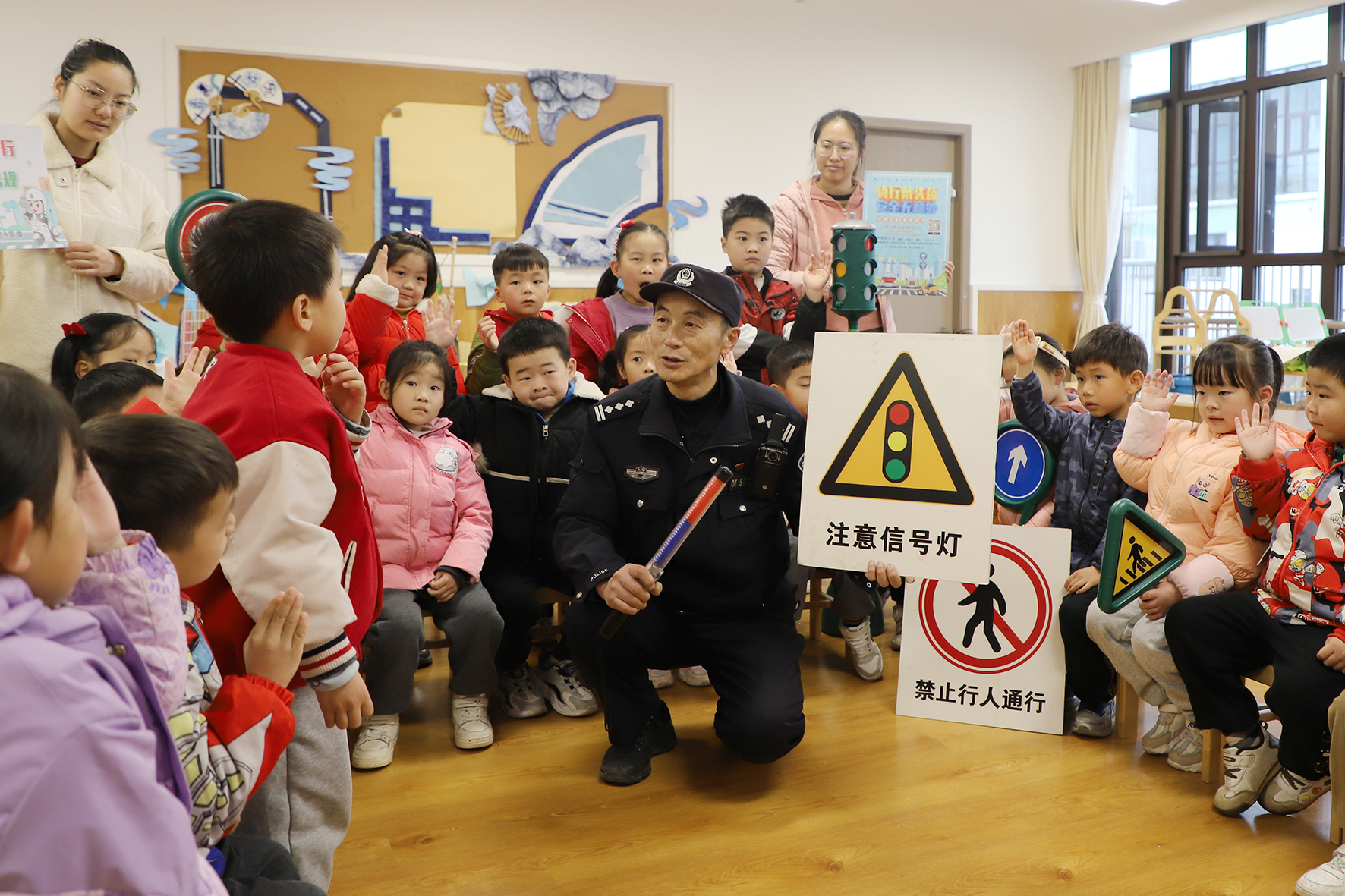 圖為民警通過(guò)趣味搶答讓小朋友學(xué)習(xí)交通安全知識(shí)。