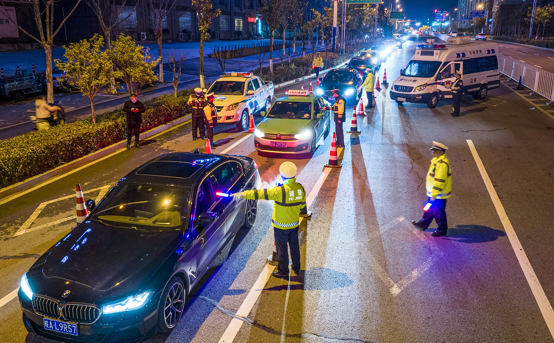 2月15日,安徽省合肥市廬江縣城區(qū)主干道上,合肥市公安交警部門正在異地用警查處酒駕違法行為。