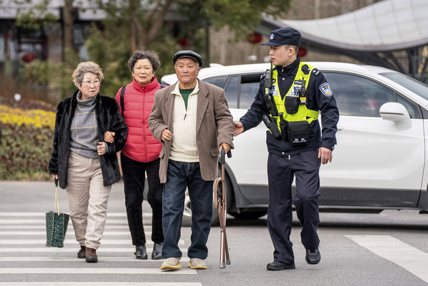 2月16日,上海市公安局崇明分局建設派出所民警在東平國家森林公園門口護送行動不便的老人過馬路。