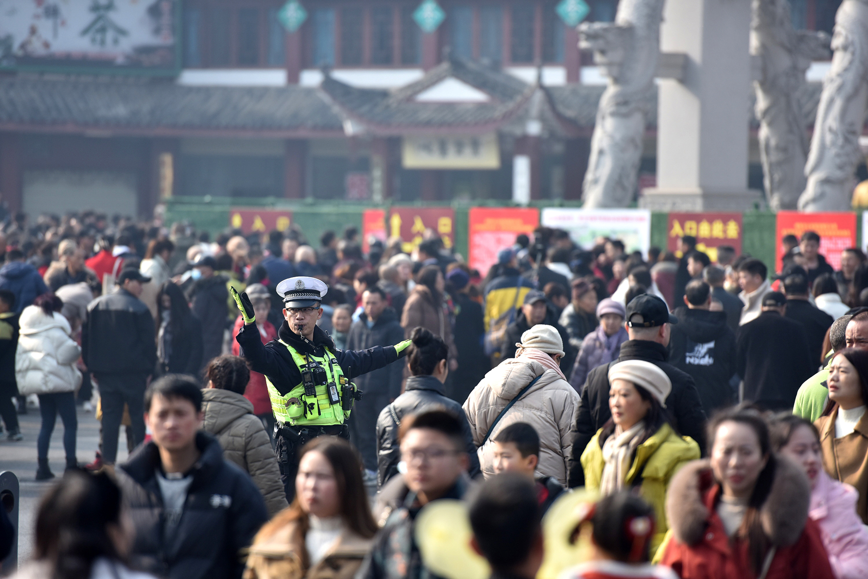 2月12日,湖北省鐘祥市公安局交警大隊民警在景區(qū)用“小喇叭”提醒游客注意安全。