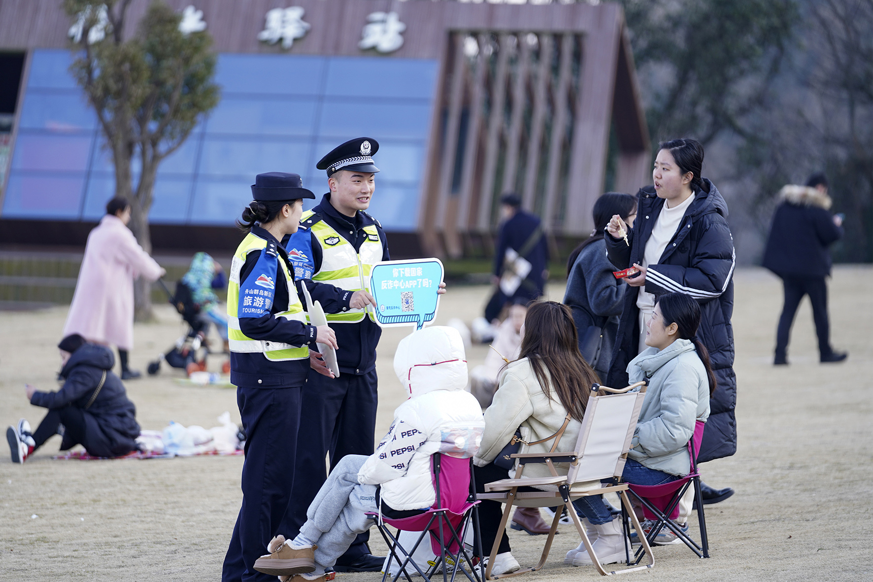 2月11日,浙江省舟山市公安局普陀區(qū)分局東港派出所民警在景點開展安全巡查、反詐宣傳及服務游客工作,守護景點平安。