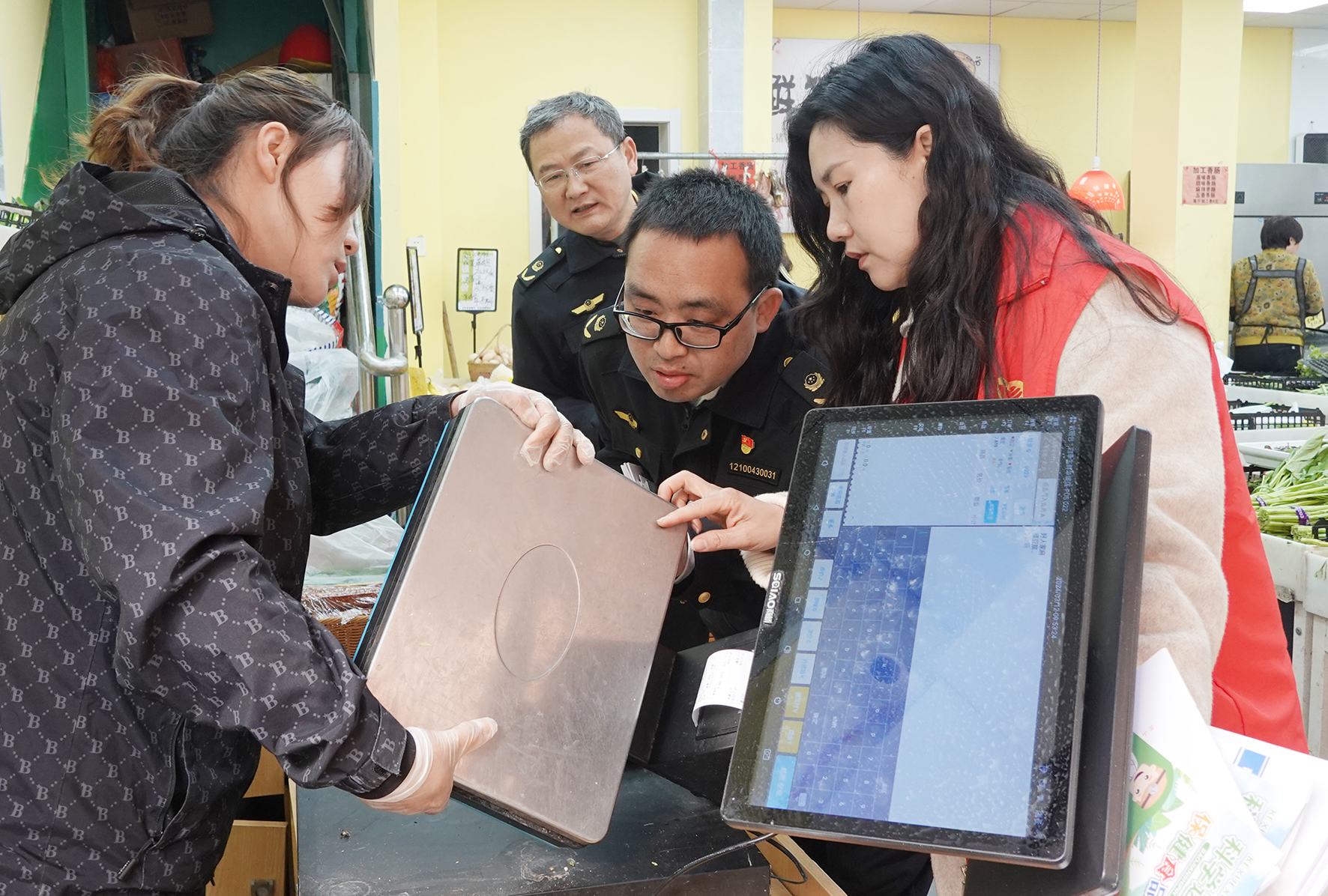 圖為執(zhí)法人員計量稱重器具進行核查。