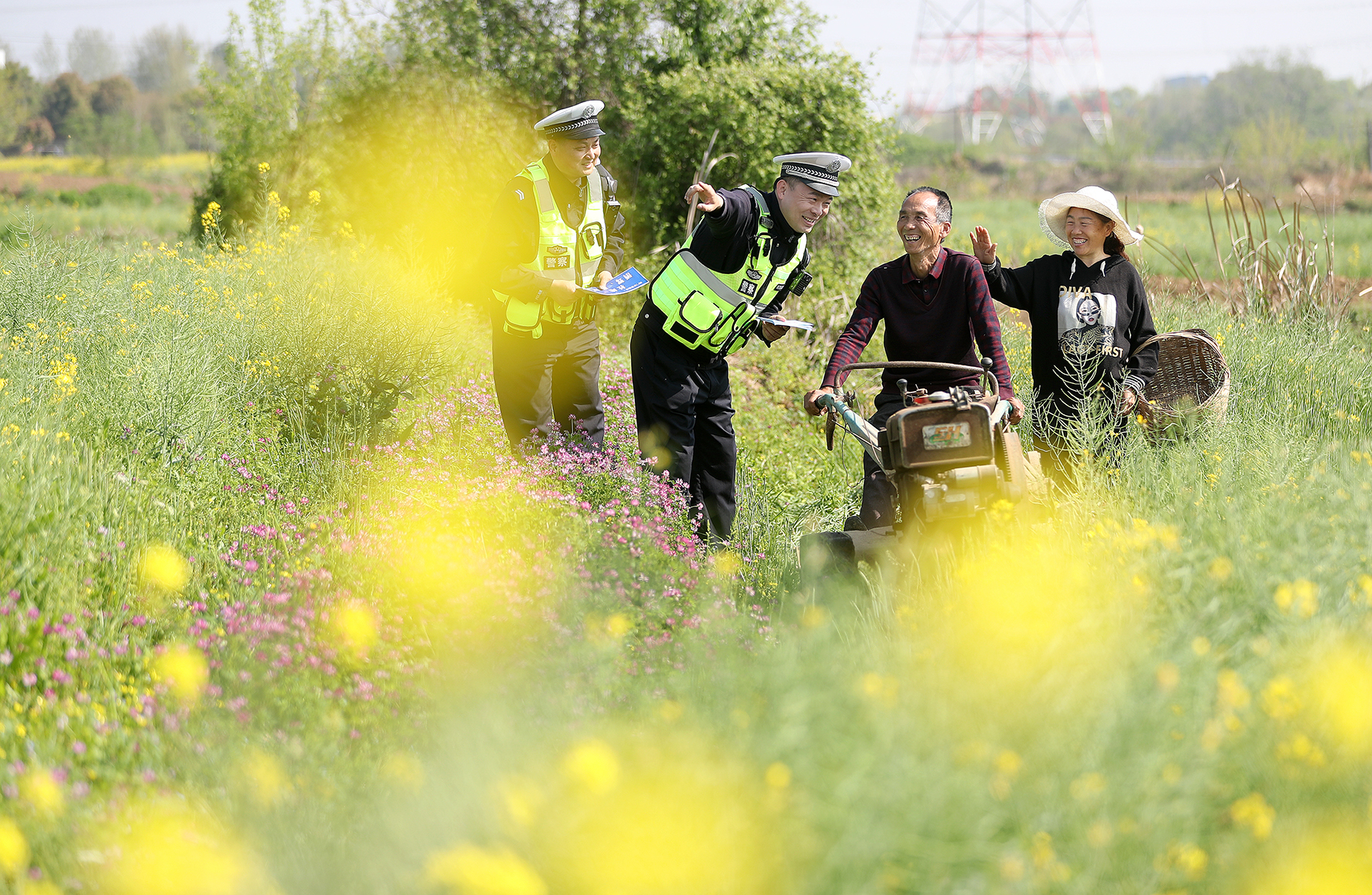 圖為4月8日,民警在蓮花村田間地頭提醒村民注意交通安全。