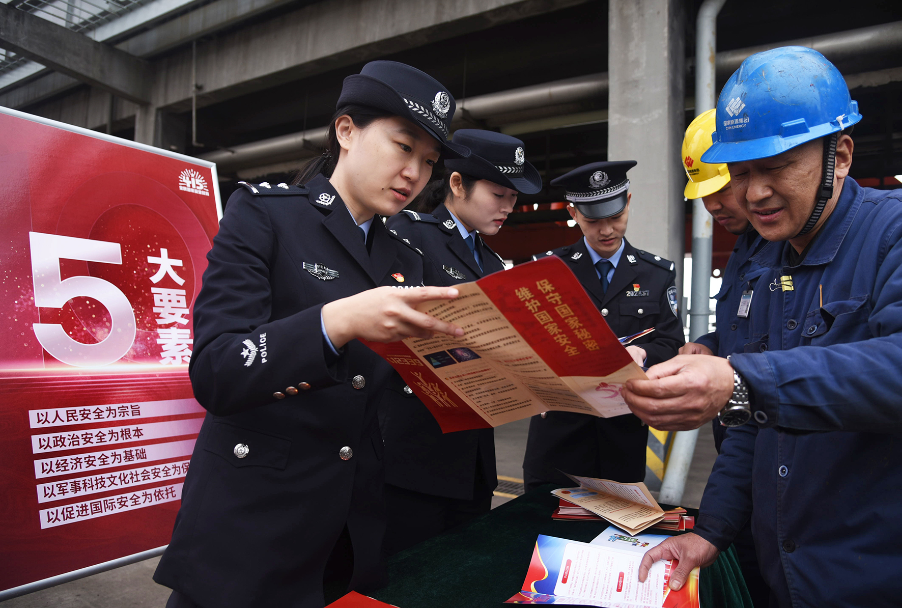 4月12日,在第九個(gè)全民國(guó)家安全教育日前夕,江蘇南京港出入境邊防檢查站組織民警深入口岸一線開展“總體國(guó)家安全觀 創(chuàng)新引領(lǐng)10周年”為主題的宣傳活動(dòng)。