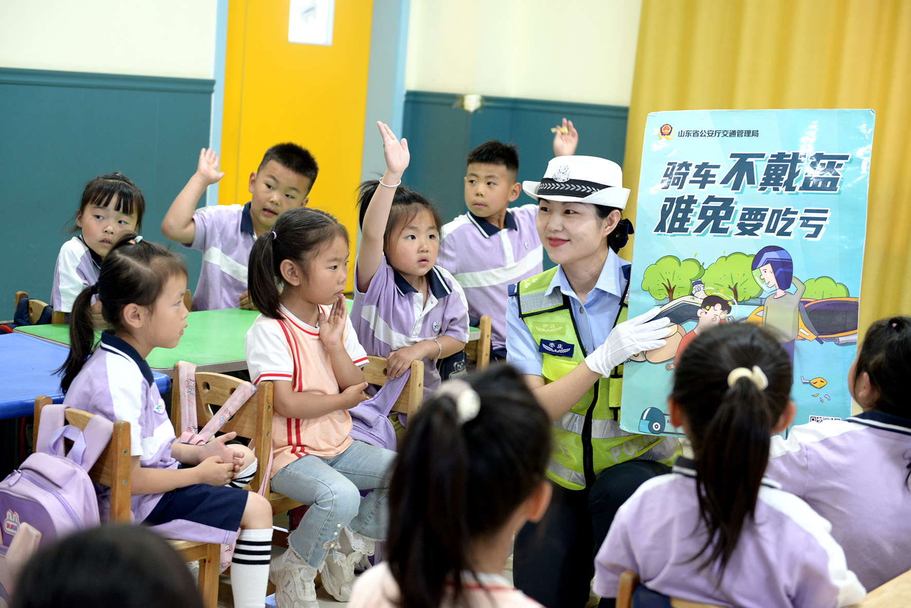 5月27日,山東省棗莊市公安局山亭分局交警大隊(duì)走進(jìn)轄區(qū)海子社區(qū)陽光幼兒園,以寓教于樂的方式,為小朋友們上了一堂生動(dòng)有趣的交通安全教育課。