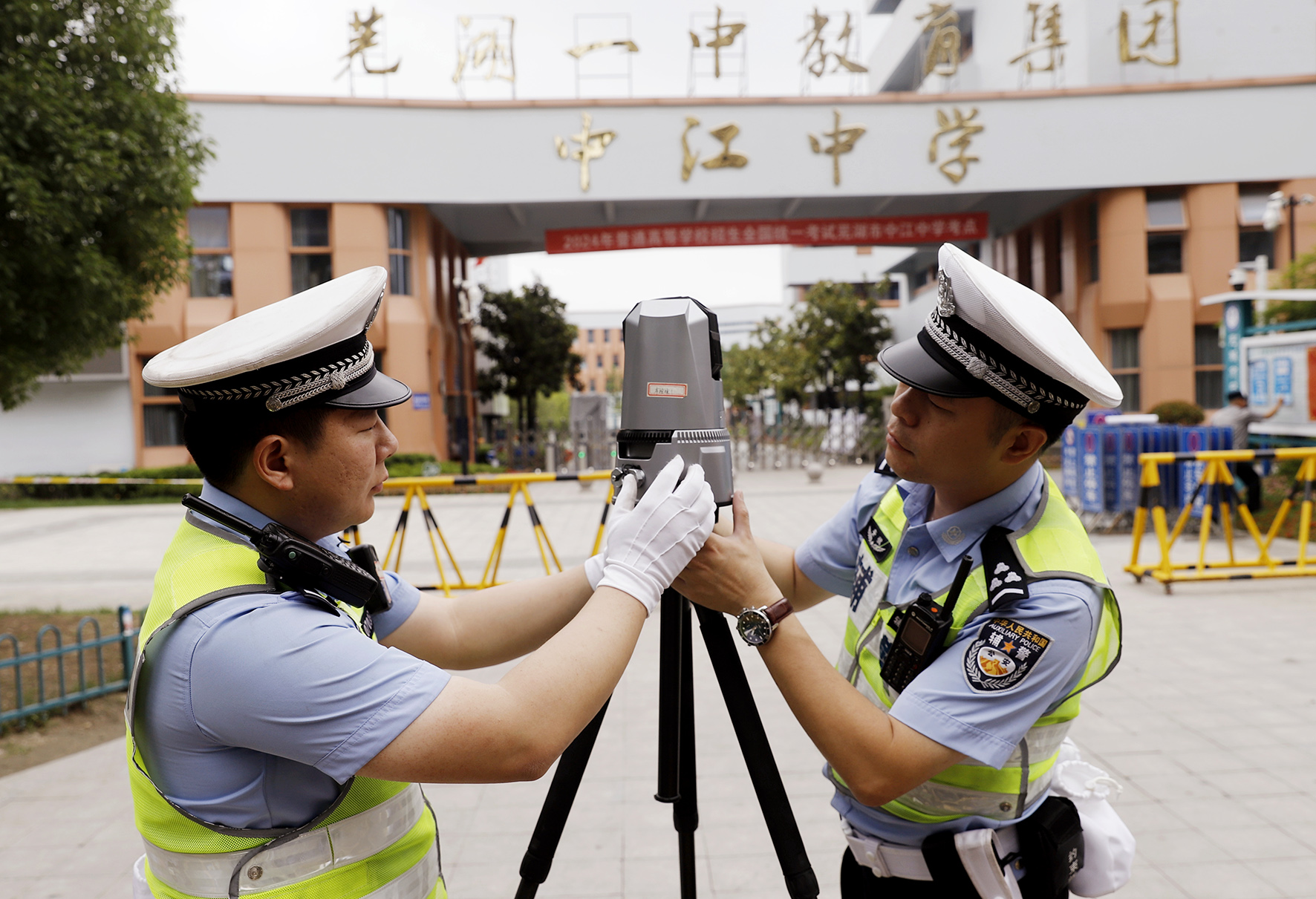 6月6日,安徽省蕪湖市公安局交警支隊(duì)鳩江大隊(duì)民警在中江中學(xué)考點(diǎn)門前路段擺放調(diào)試布控球臨時(shí)監(jiān)控設(shè)備。